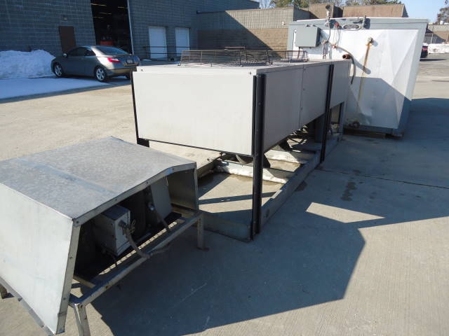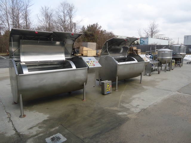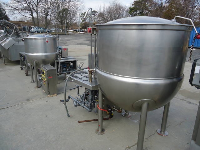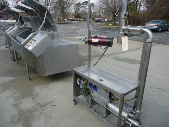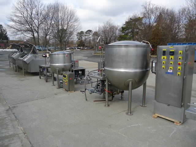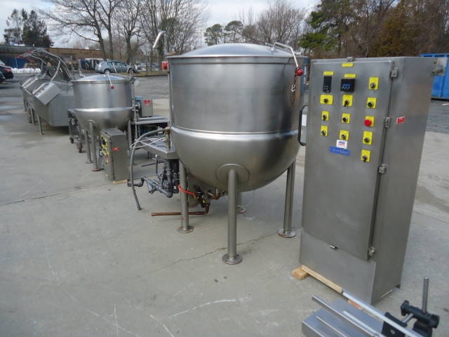 1-USED CLEVELAND COOK/CHILL PACKAGING LINE. CONSISTS OF TWO (2) CLEVELAND P-TC-120-CC STAINLESS STEEL TUMBLE CHILLERS, CLEVELAND 200 GALLON AND 120 GALLON STAINLESS STEEL JACKETED SCRAPER AGITATED KETTLES and CLEVELAND METERING FILL STATION/TIPPER TIE CLOSURE. SYSTEM HAS CONTROL PANELS AND ICE BUILDER WITH CONDENSING UNIT AND PUMP. (STOCK # 7664X)