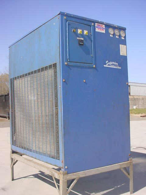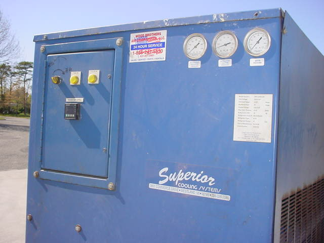 1-USED SUPERIOR COOLING SYSTEMS MODEL SPC-1200A-236 LIQUID CHILLER, SERIAL #22096JT. EQUIPPED WITH APPROX. 1-1/2" DIAMETER SANITARY TRI-CLAMP LIQUID INFEED AND OUTLET CONNECTIONS. MANUFACTURED IN YEAR 2000, BUT NEVER PUT INTO PRODUCTION. ELECTRICAL 3/60/230 VOLT, CONTROL VOLTAGE 1/60/230 VOLTS. REFRIGERATION HP 12, REFRIGERANT R-22, REFRIGERANT CHARGE 37 LBS.