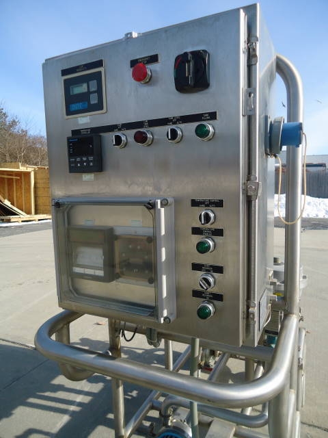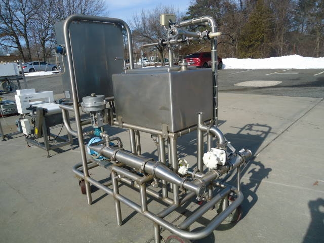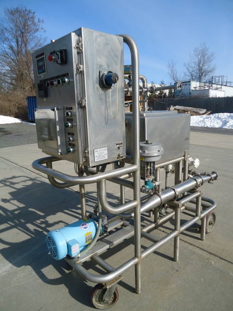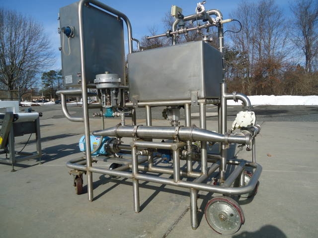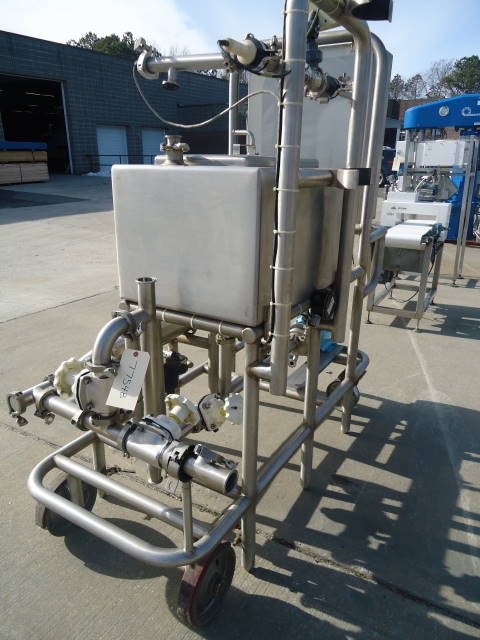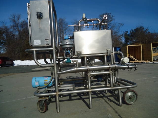 1-USED GMP SYSTEMS STAINLESS STEEL CLEAN-IN-PLACE (CIP) SYSTEM. WITH STAINLESS STEEL CONTROL PANEL, THIS SYSTEM IS ON CASTERS FOR PORTABILITY. EQUIPPED WITH WAUKESHA MODEL 2045 SANITARY CENTRIFUGAL PUMP. FEATURES INCLUDE STAINLESS STEEL PIPING AND VALVES AND APPROX. 21 IN. X 28 IN. X 17 IN. STAINLESS STEEL RECTANGULAR TANK. (STOCK #7754B)
