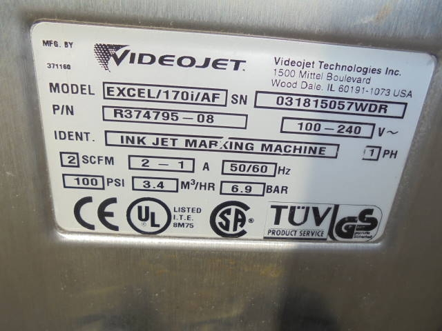1-Used VideoJet “Excel 170i/AF Ink Jet Printer/Coder, S/N 031815057WDR.  With stainless steel cabinetry, machine on stainless steel base with casters for portability.  Electrics:  single phase, 100/240 volt.  (Stock #8145D)