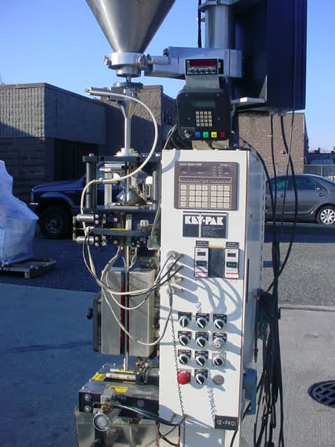 1-USED KEY-PAK MODEL V-200-BSP SINGLE TUBE VERTICAL FORM/FILL/SEAL MACHINE, S/N 242. EQUIPPED WITH DURANT SYSTEMS MODEL 6450 DIGITAL CONTROL PANEL. FEATURES INCLUDE ELECTRIC EYE REGISTRATION AND BELL-MARK MODEL A4152 CODER. SUPPLIED WITH TOP MOUNTED SPEE-DEE MODEL 1000 AUGER FILLING HEAD, S/N A152, WITH AGITATED HOPPER AND "LEVEL-TEK" DEVICE. WITH TOP MOUNTED INDEPENDENT CONTROL PANEL FOR FILLING HEAD.