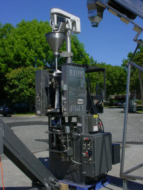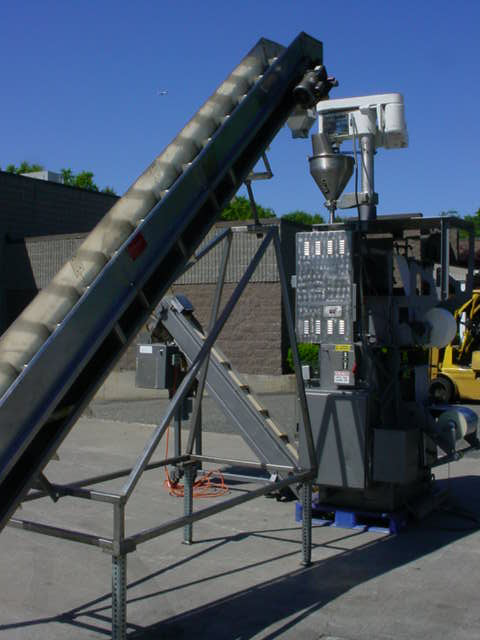 1-USED ROVEMA VPU-180 VERTICAL BAGGING MACHINE, S/N 6561. LAST USED FOR COFFEE PACKAGING, THIS FORM FILL SEAL MACHINE CAN BE USED FOR EITHER POWDER PACKAGING OR PACKAGING OF SOLID PRODUCTS SUCH AS A FILTER BAG. WITH TOP MOUNTED MATEER MODEL 31A AUGER FILLING HEAD, WITH STAINLESS STEEL AGITATED HOPPER, BAGGING MACHINE HAS DIGITAL TEMPERATURE CONTROLS AND DIGITAL BAG COUNTER. CAN BE SUPPLIED WITH APPROX. 12" WIDE X 15′ LONG STAINLESS STEEL CLEATED INCLINED BELT CONVEYOR, AS WELL AS APPROX. 8" WIDE PORTABLE TAKE AWAY CONVEYOR FOR FINISHED POUCHES.