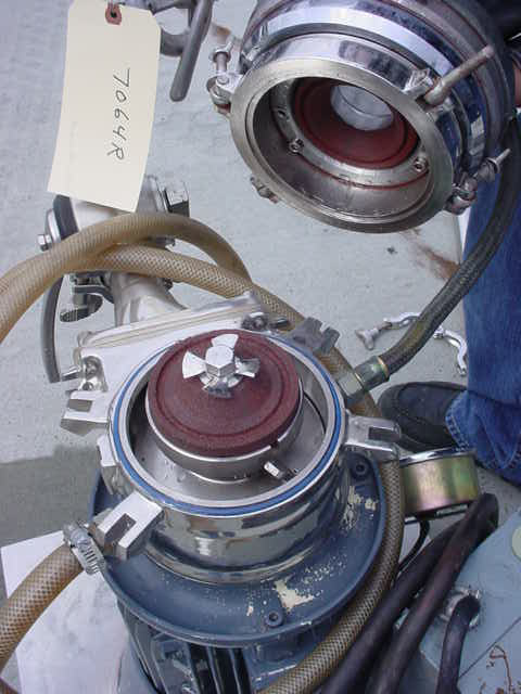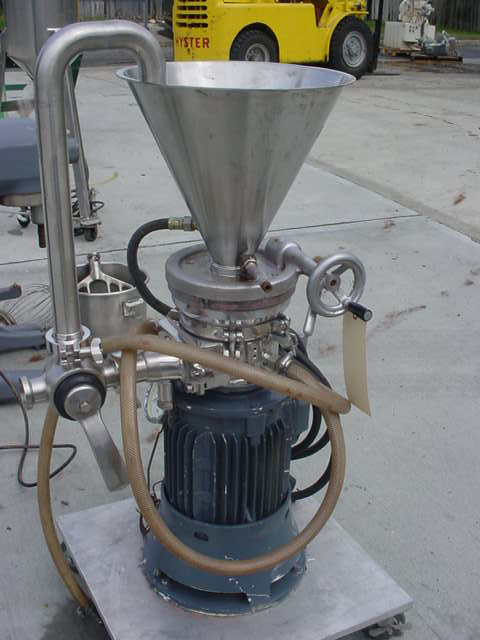 1-USED FRYMA TYPE MK-95R VERTICAL CORUNDUM STONE MILL, SERIAL #785515. WITH STAINLESS PARTS, MILL HAS CORUNDUM STONE GRINDING ELEMENT, DRIVEN BY 4KW ELECTRIC MOTOR. WITH APPROX. 13″ DIAMETER STAINLESS PRODUCT HOPPER AND RE-CIRCULATION PIPE W/VALVE. MOUNTED ON PORTABLE BASE WITH CASTERS.
