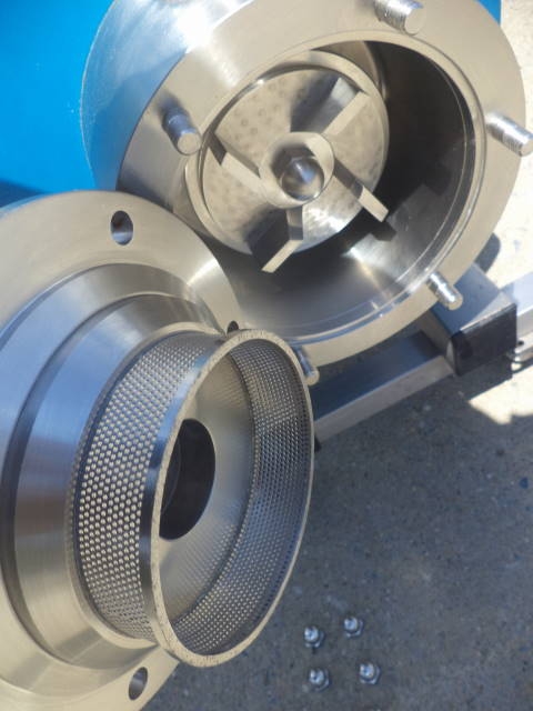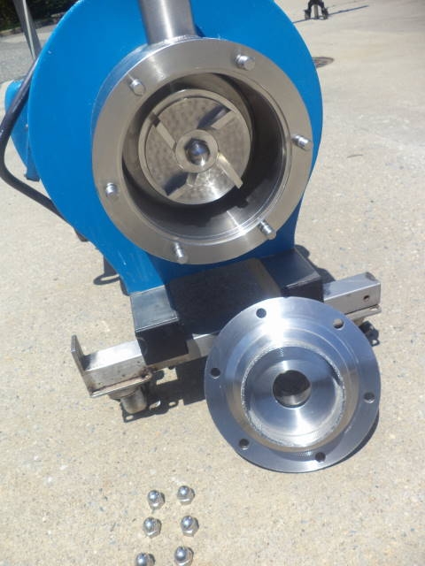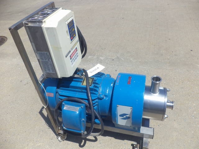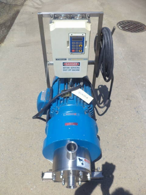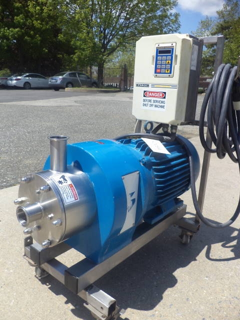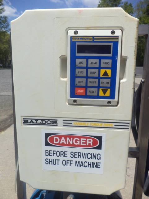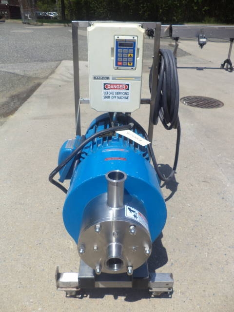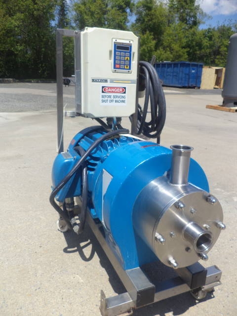 1-Used Silverson Model 450LS Stainless Steel Inline High Shear Mixer, Machine #450LSB2205. Driven by 15HP/10HP 3/60/230-460 Volt Explosion Proof Motor. With approx. 2 in. diameter tri-clamp inlet and outlet ports, unit has Baldor variable torque drive with digital controls for variable speed operation. Mounted on stainless steel stand with casters for portability. (Stock # 8005A)