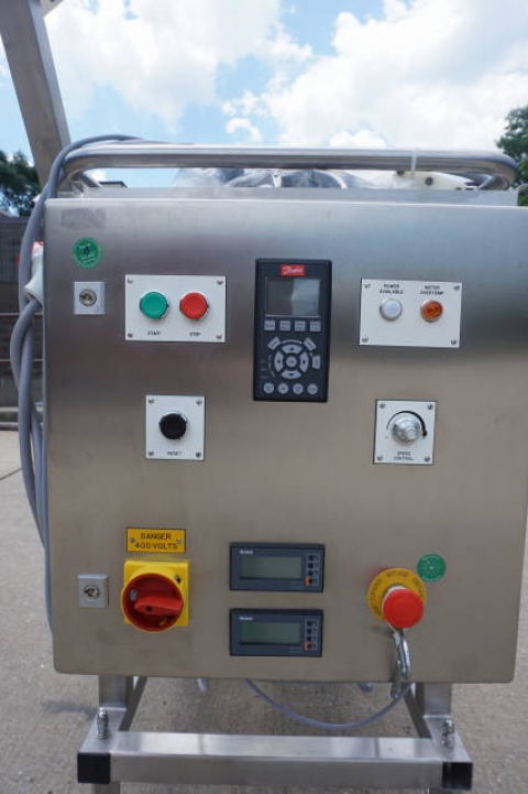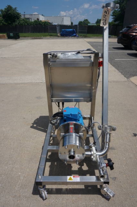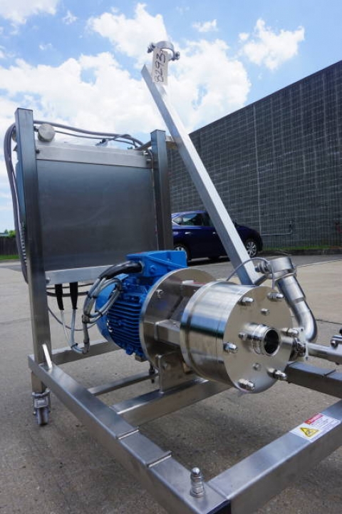 1-Silverson Model 450UHS Stainless Steel Ultra Hygienic High Shear Inline Mixer, S/N 450LSM2975. Mounted on portable stainless steel frame, machine has stainless steel multi-function control panel which includes digital RPM controller, digital temperature controller, and resistance thermometer. Driven by 7.5 Kw (10 HP 3 phase, 460 volt electric motor). Suitable for a wide variety of applications, including mixing, emulsifying, homogenizing, disintegrating and dissolving, all under sanitary conditions. (Stock # 8293)