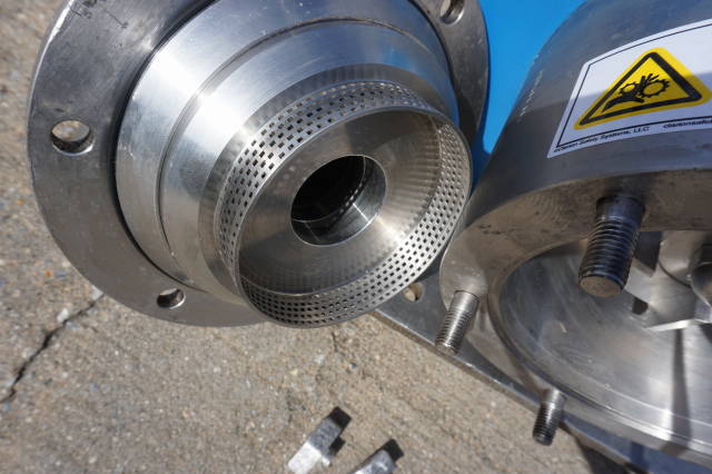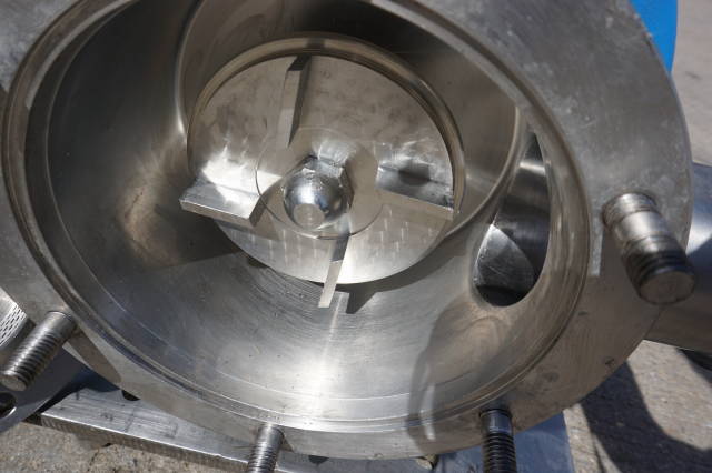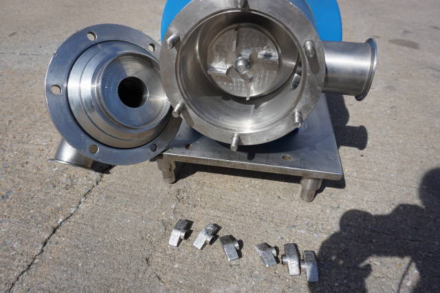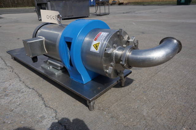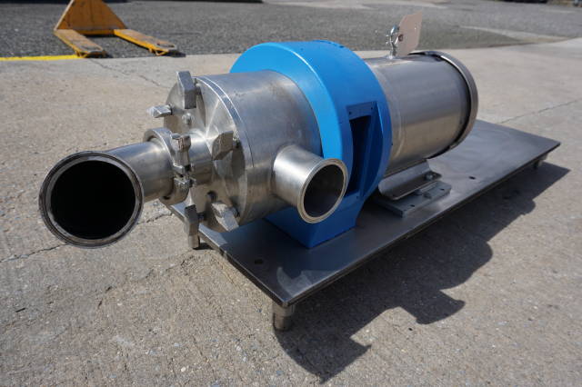 1-Used Silverson Stainless Steel Inline High Shear Mixer. Equipped with approx. 3 in . diameter tri-clamp sanitary inlet and outlet ports, unit driven by 7-1/2 HP 3/60/230-460 volt 3,500 RPM stainless steel “washdown” motor. Mounted on stainless steel base, machine last used in the food industry, machine has square hole high shear screen, which provides for high shear rates of soluble and insoluble granular solids. Also suitable for the preparation of emulsions, gels, and fine colloidal suspensions. (Stock #8350)