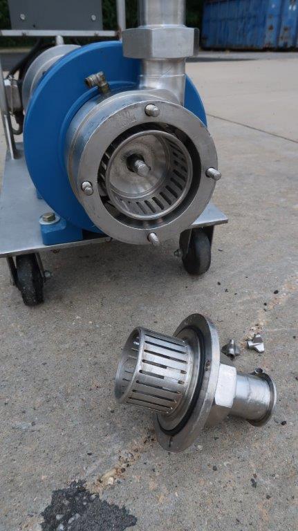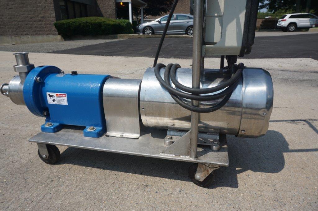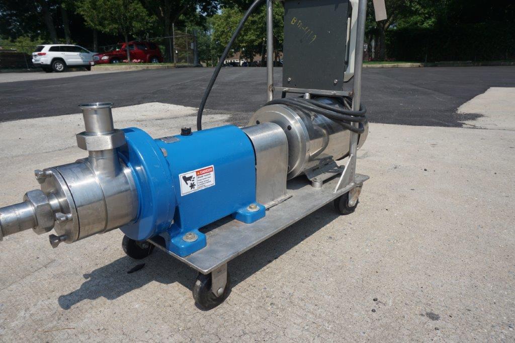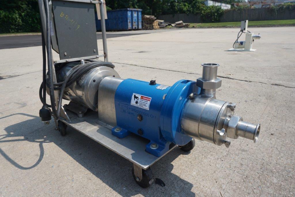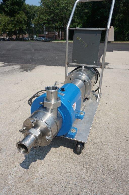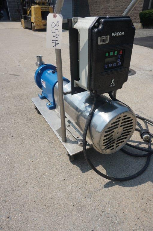 1-Used Waukesha Model SP4 Stainless Steel Inline Shear Pump, S/N 1000002625486. Suitable for blending, mixing, emulsifying, texturizing and smoothing, this shear pump is driven by 10 HP, 3/60/208-230/460 Volt 3525 RPM stainless steel motor. Equipped with tri-clamp inlet and outlet ports, each measuring approx. 2 In. diameter. Equipped with Vacon “X Series” variable frequency drive, machine is mounted on portable base with casters and push-bar. (Stock #8539A)