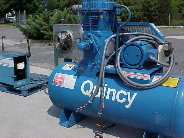 1-USED QUINCY MODEL FE350 TANK MOUNTED AIR COMPRESSOR, SERIAL #5012703. DRIVEN BY 10HP 3/60/200-230-460 VOLT MOTOR. TANK RATED 200 PSI, NATIONAL BOARD AND CODE STAMPED. CAN BE SUPPLIED WITH ARROW DRYER AND AFTERCOOLER.