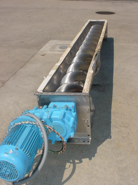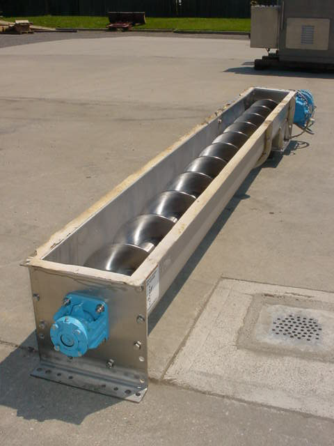 1-Used stainless steel horizontal motorized screw conveyor. Equipped with approx. 11″ diameter x 10′ long stainless steel conveyor mounted in horizontal trough. Driven by 5 hp 3/60/230-460 volt motor and reducer. Screw conveyor has approx. 7″ diameter bottom discharge.