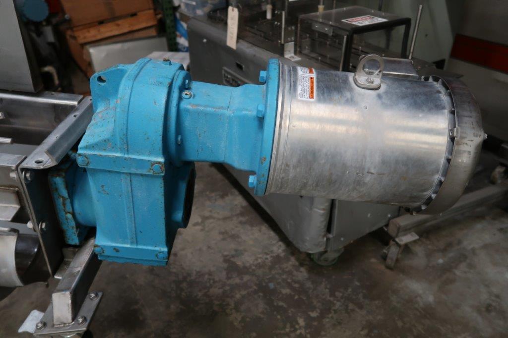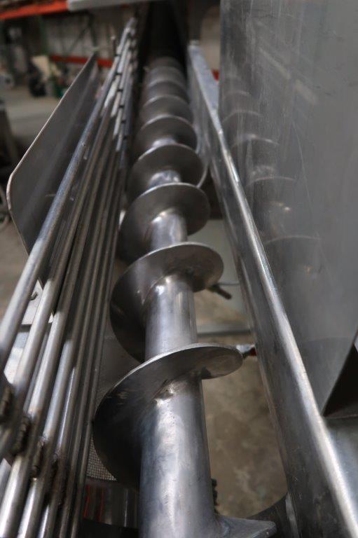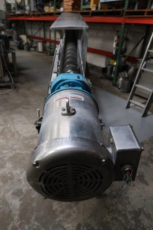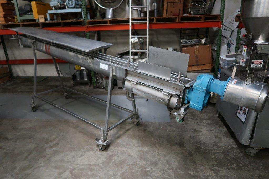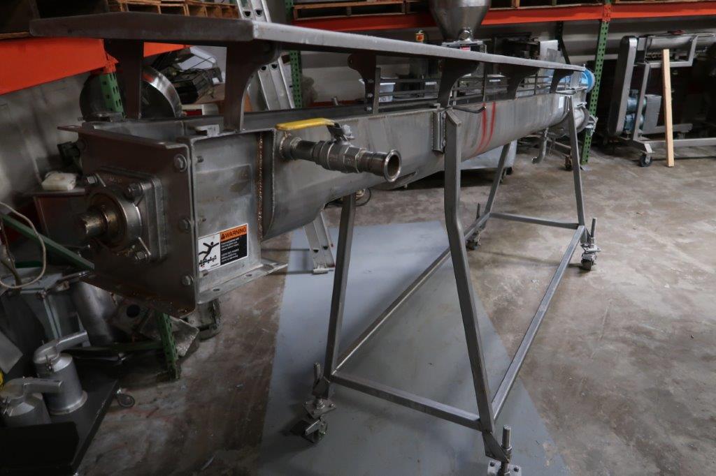 1- Used 6 In. Diameter Stainless Steel Jacketed Inclined Portable Screw Conveyor. With approximately 13 ft. long screw, this jacketed conveyor was last used in the food industry. Mounted on stainless steel base with casters for portability. With top “safety shield”, conveyor is driven by Stainless 3/60/208-230/460 Volt motor. (Stock# 8473X)