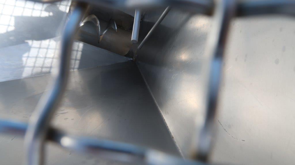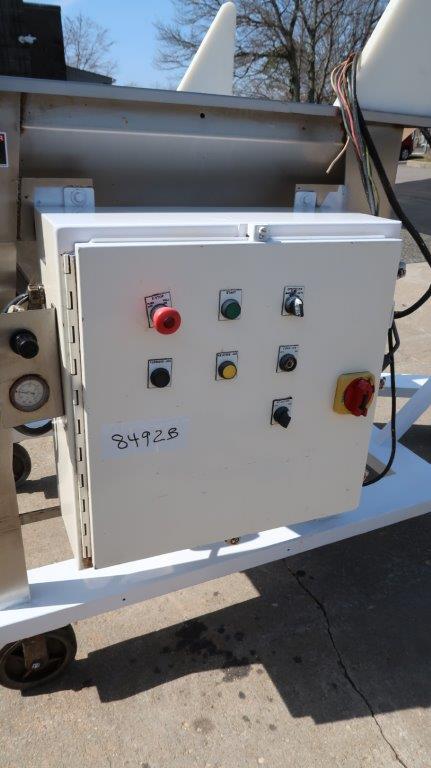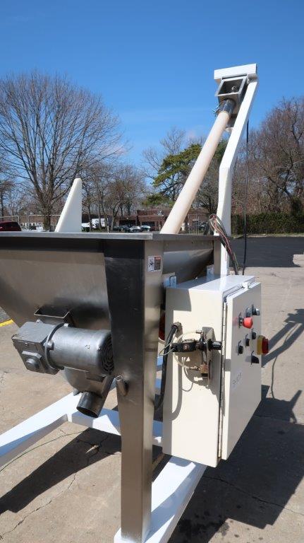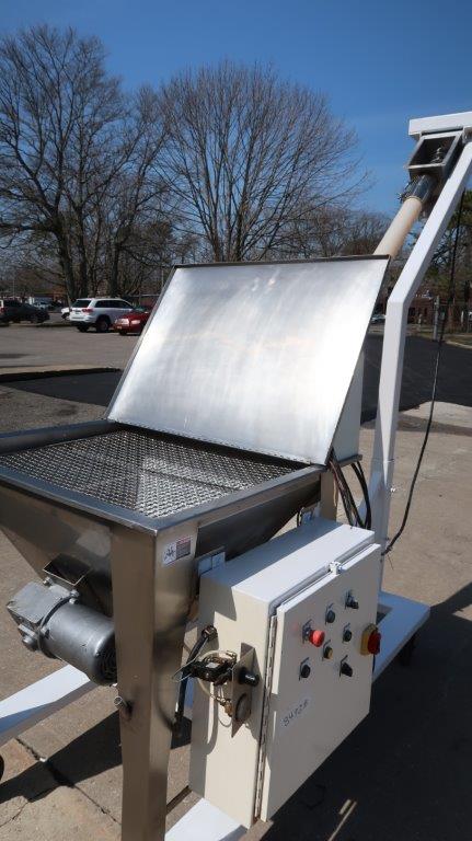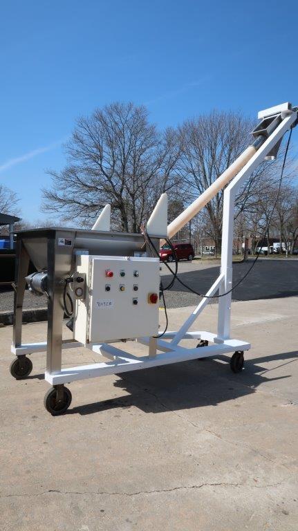 1-Used AMS portable inclined flexible screw conveying system. Equipped with 4 In. diameter flexible screw and outer plastic housing, screw has overall length of approximately 11 feet. With 36 In. X 36 In. stainless steel loading hopper with motorized pre-breaker, safety grate, and lid. With top mounted drive motor, system equipped with control panel and is on portable base with casters. Last used in the food industry, present discharge height is approximately 98 inches from top chute to floor (Stock #8492B)