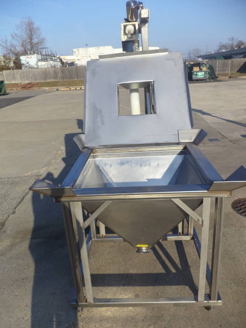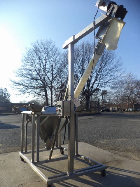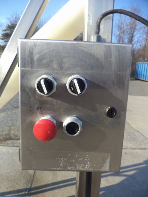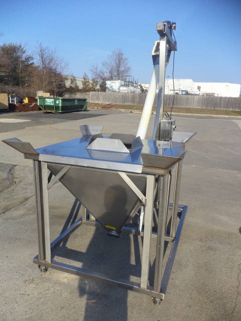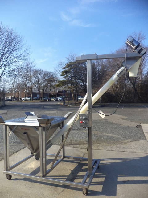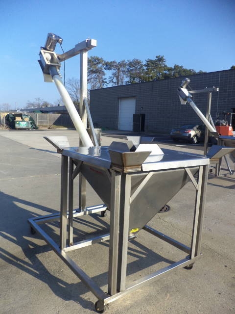 1-Used Flexicon Stainless Steel Portable Inclined Flexible Screw Conveyor/Feeder. Equipped with 4 In. diameter stainless steel screw encased in flexible plastic outer housing. Mounted on stainless steel base with casters, current screw discharges at 7 ft. height. Hopper has top lid and measures approx. 36 in. X 36 in. Equipped with Sterling 3/4 HP 3/60/208-230-460 volt stainless steel encased motor. With stainless steel starter box, Feeder last used in food use. (Stock #7978B)