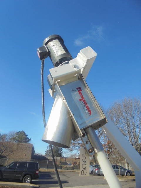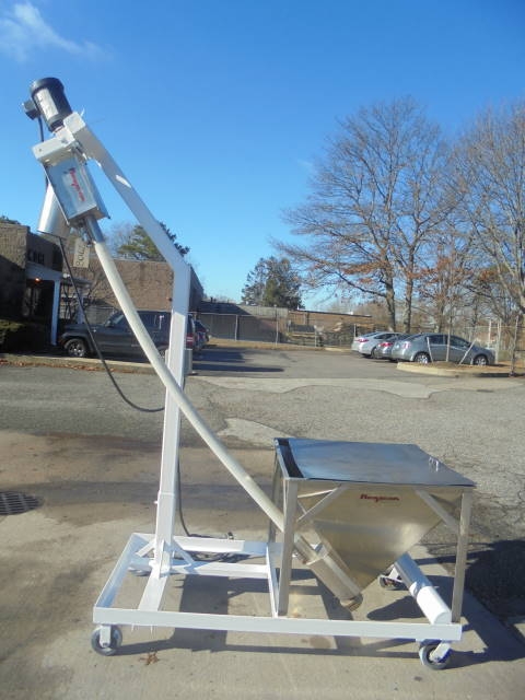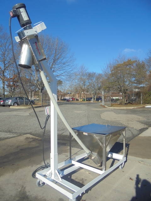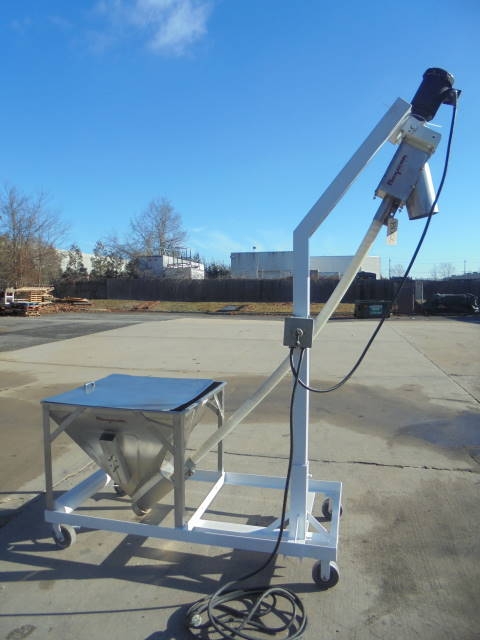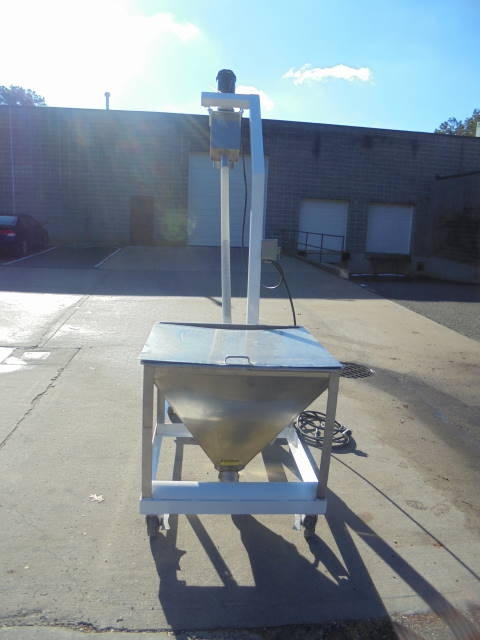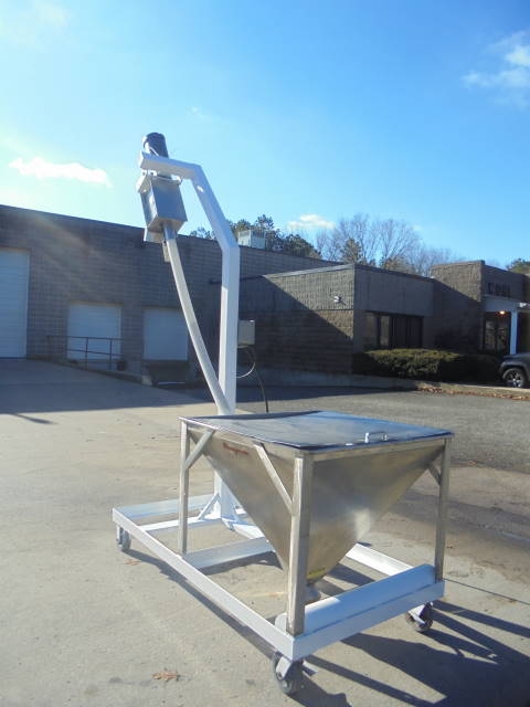 1-Used Flexicon Portable Flexible Conveying System. On portable base with casters, this Feeder/Screw Conveyor has stainless steel screw encased in flexible plastic outer housing. Equipped with stainless steel hopper measuring approx. 36 in. x 36 in. Unit driven by 2 HP 3/60/208-230-460 volt motor. (Stock #8062)