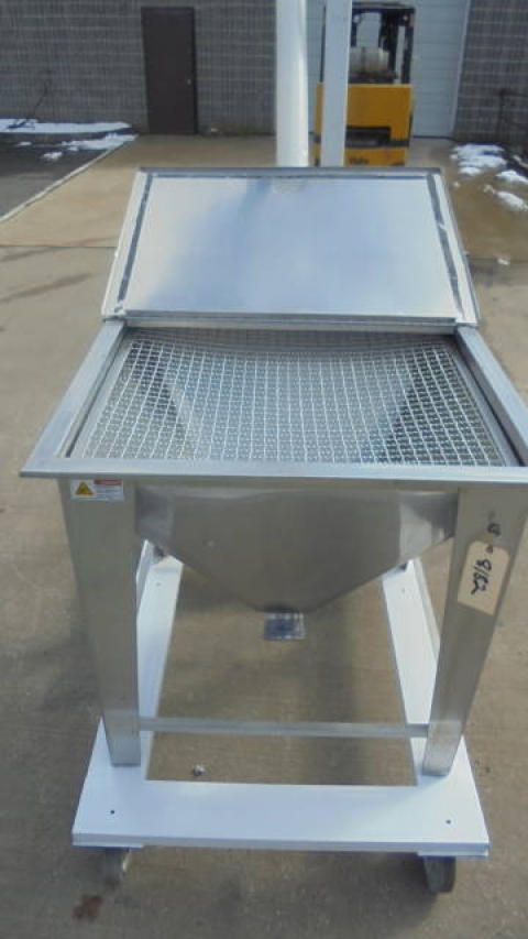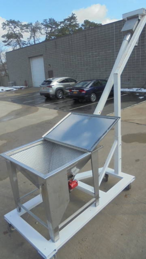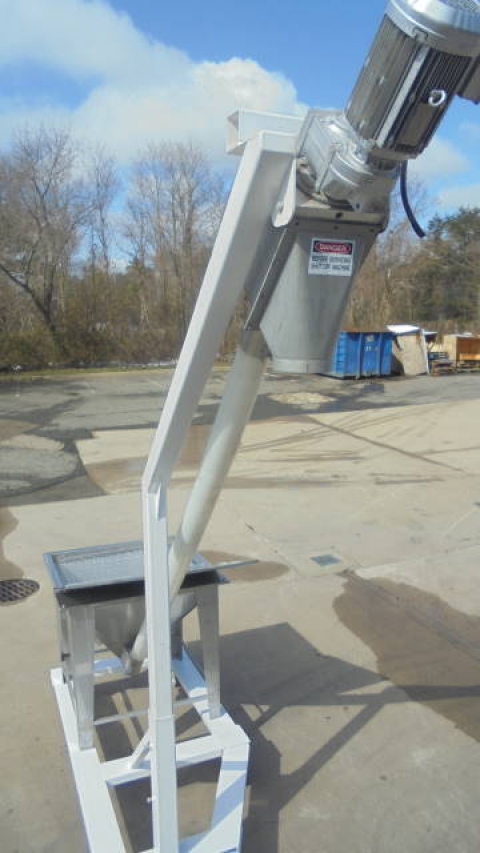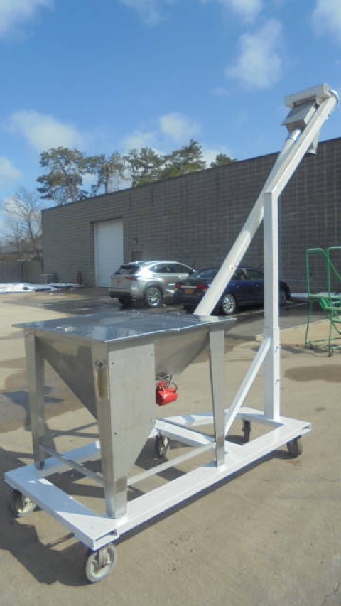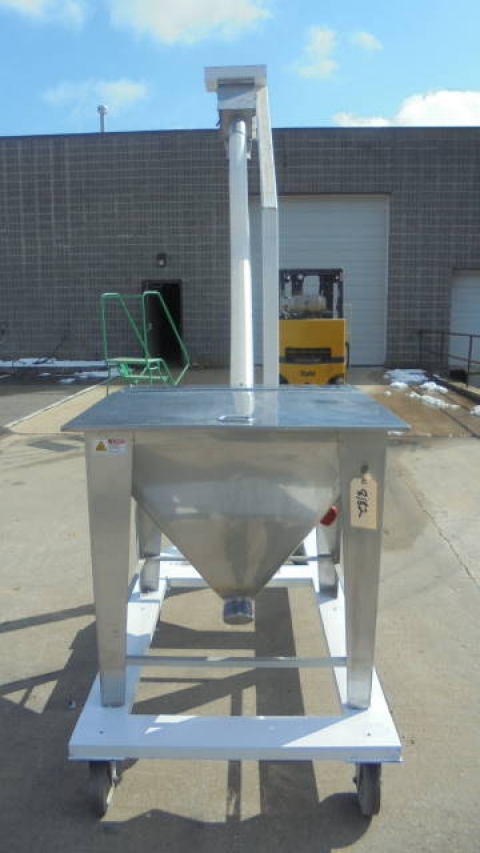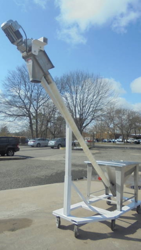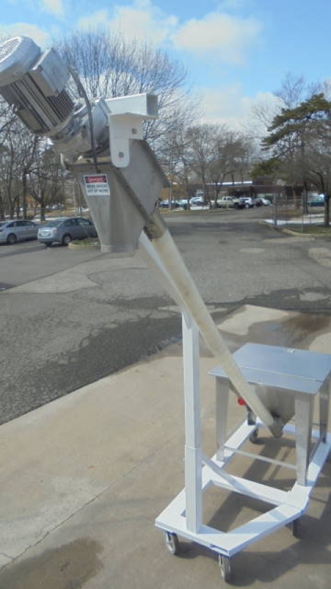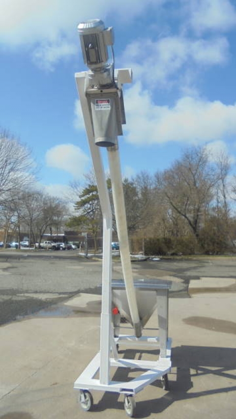 1-Used Portable Flexible Conveying System. On portable base with casters, this Feeder/Screw Conveyor has stainless steel 4″ diameter screw encased in flexible plastic outer housing. Equipped with stainless steel hopper measuring approx. 36 in. x 36 in., unit has safety grate, lid and vibrating attachment and is driven by 3 HP, 3/60/230-460 volt motor. (Stock #8182)