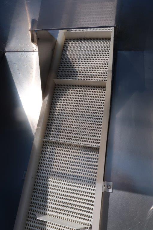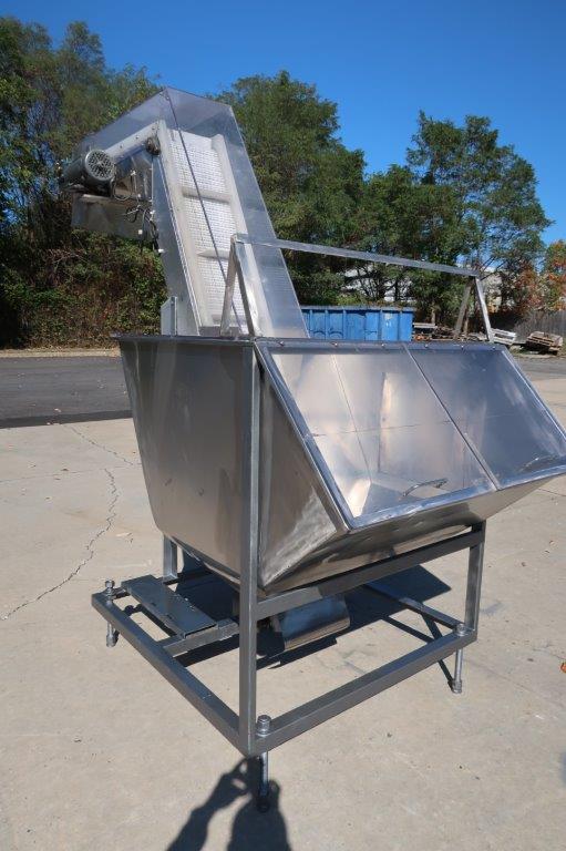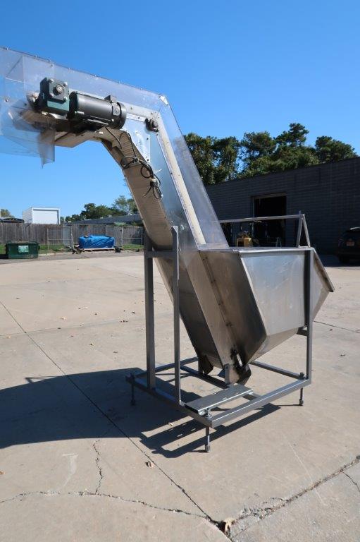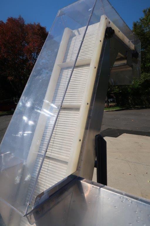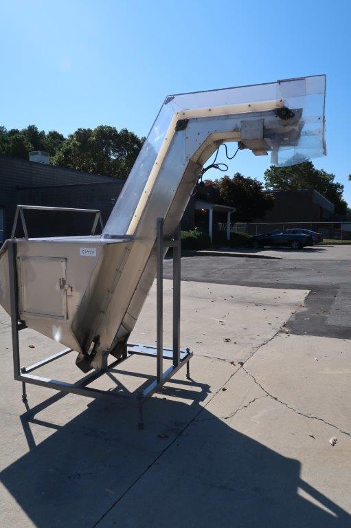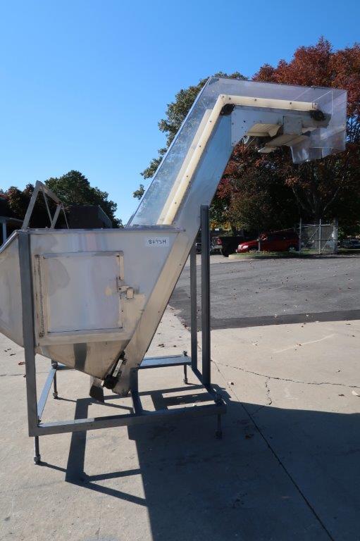 1 – Used Inclined Cap Elevator/ Cleated Belt Conveyor, 11 In. wide Belt. with approx.. 84 In. discharge height, this feeder has 2 In. high cleats spaced on 12 In. centers. Last used in personal care products industry. (Stock # 8693H)