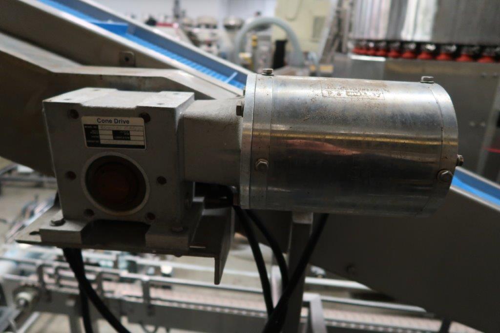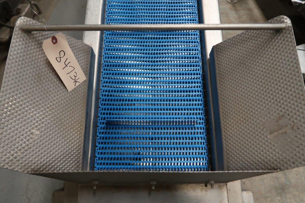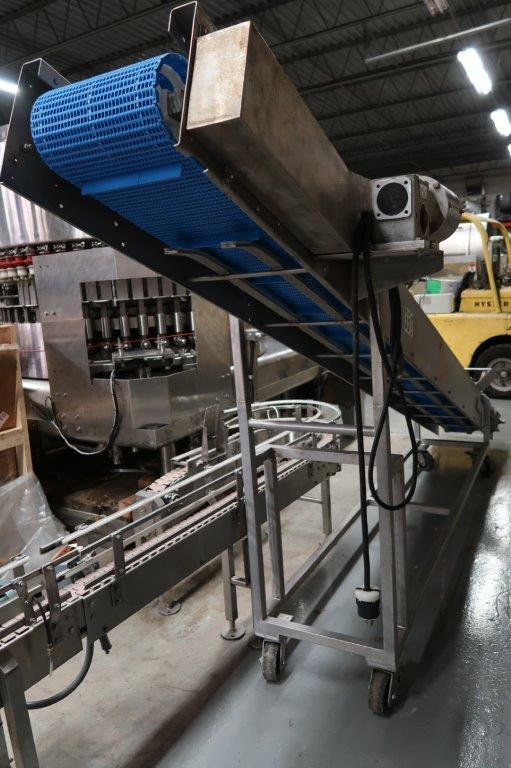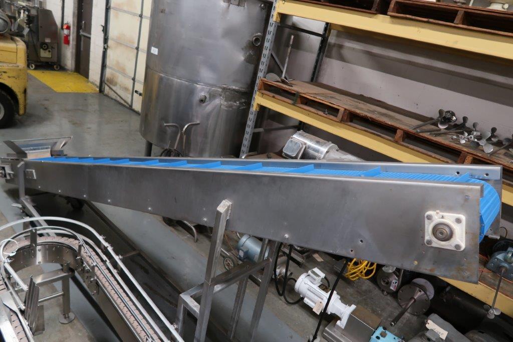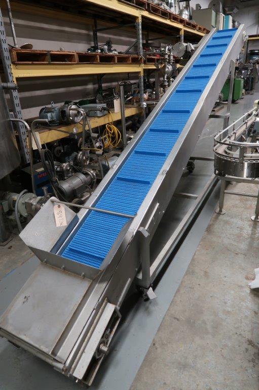 1-Used 12 In. Wide Stainless Steel Inclined Cleated Belt Conveyor. Mounted on stainless steel portable base with casters, conveyor has inclined belt of approximately 13 ft. long. Driven by 3 phase stainless steel electric motor, conveyor has cleats measuring 12 In. cleat to cleat (centers). Present discharge height is approximately 64 In. Last used in food processing operation. (Stock# 8473K)