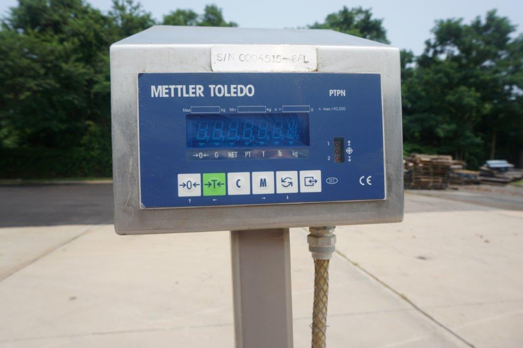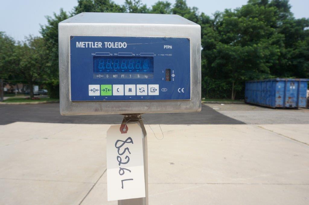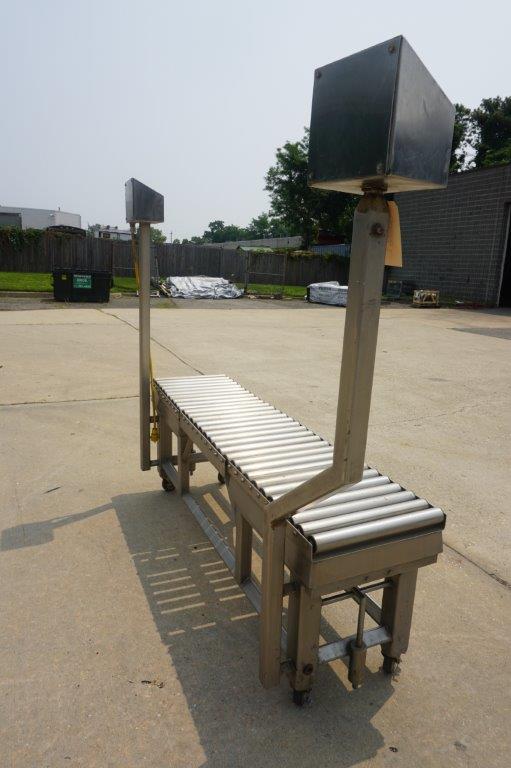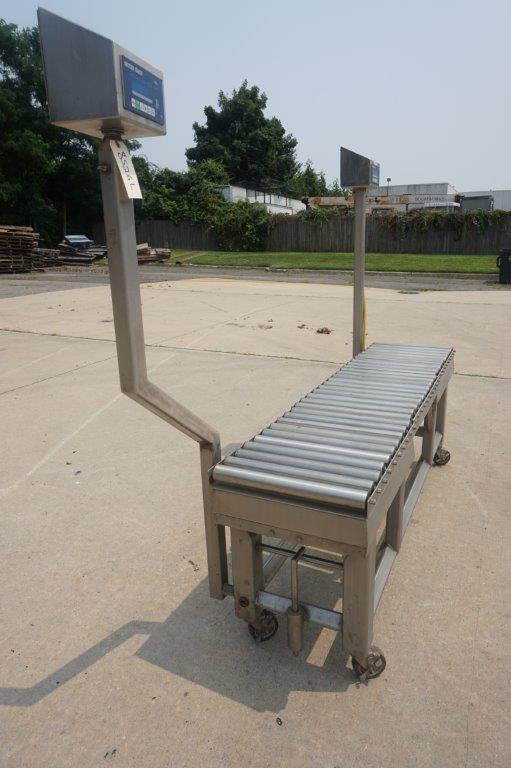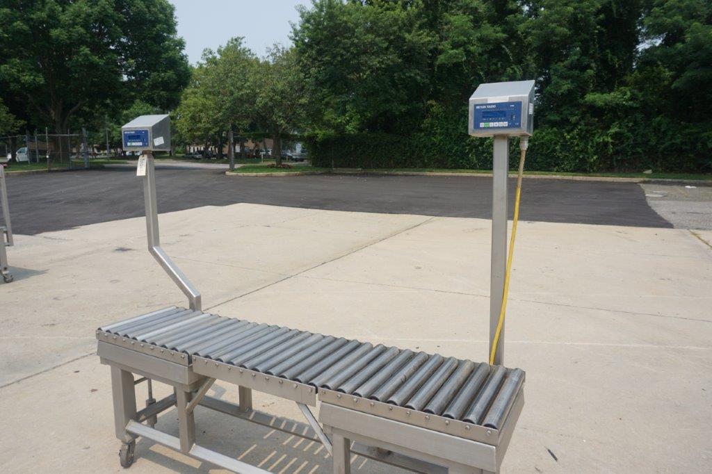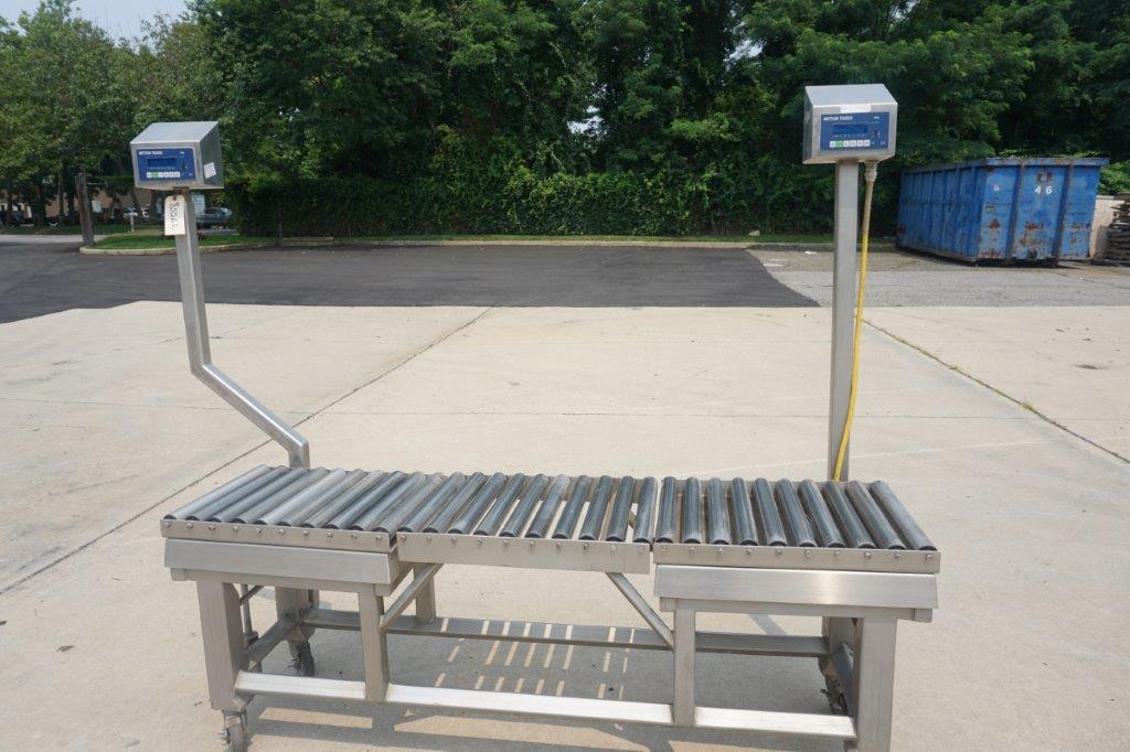 1 – Used 18 In. Wide X 72 In. Long Stainless Steel Roller Conveyor. Mounted on stainless steel base with casters, conveyor is equipped with two (2) Mettler Toledo scales with single phase electrics. Last used in the food industry. (Stock # 8526L)