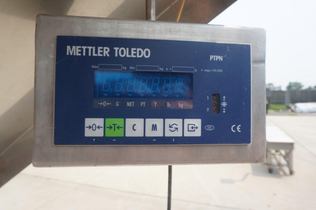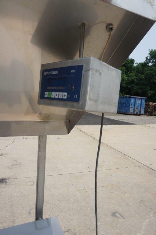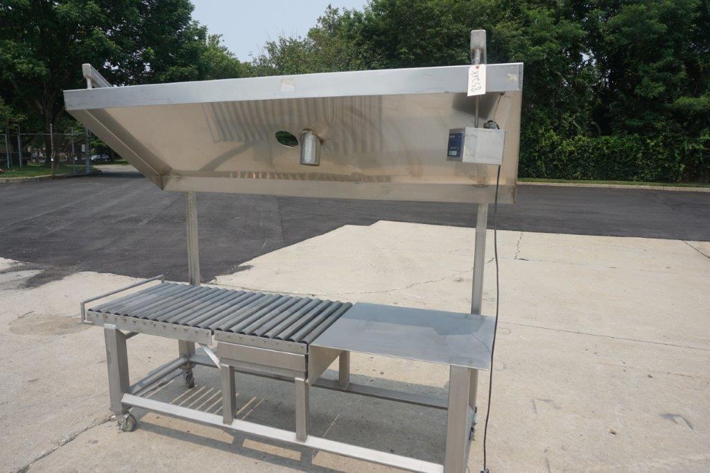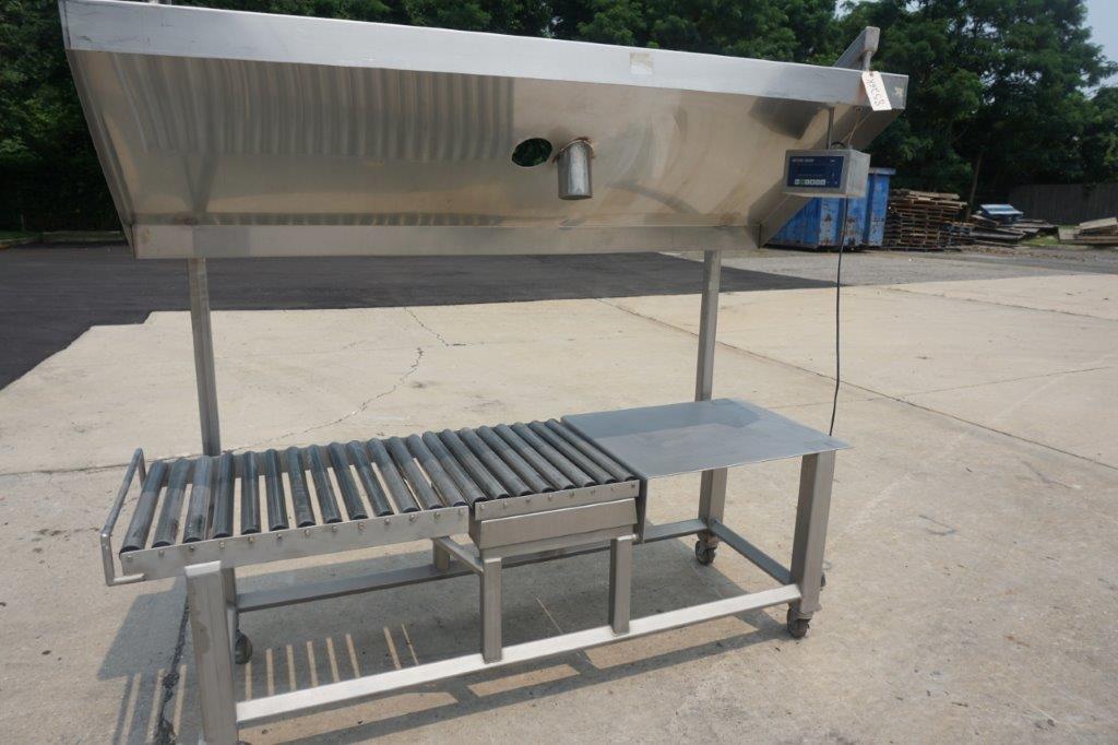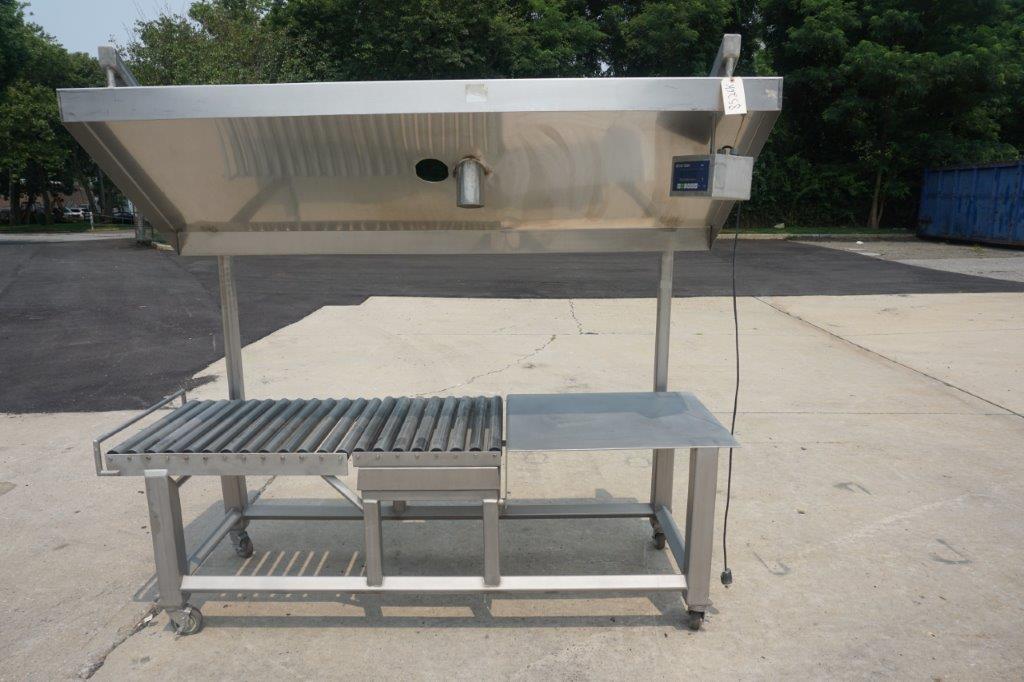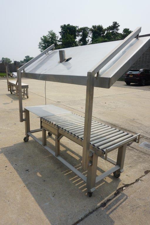 1- Used 24 In. Wide X 84 In. Long Stainless Steel Roller Conveyor. Mounted on a stainless steel base with casters, conveyor has over head stainless steel hood. Equipped with Mettler Toledo digital scale with single phase electrics. Last used in the food industry. (Stock # 8526K)