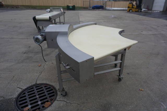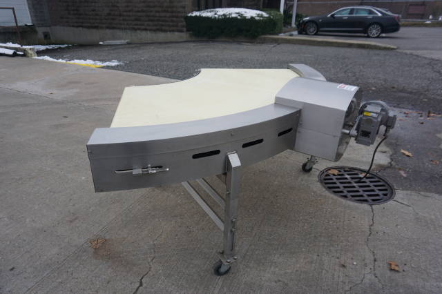 1-Pre-Owned 34 In. Wide Stainless Steel Curved Belt Conveyor. This Food Grade Conveyor is on casters for portability and is driven by a fractional HP motor. Last used in pasta production. (Stock # 8323G)