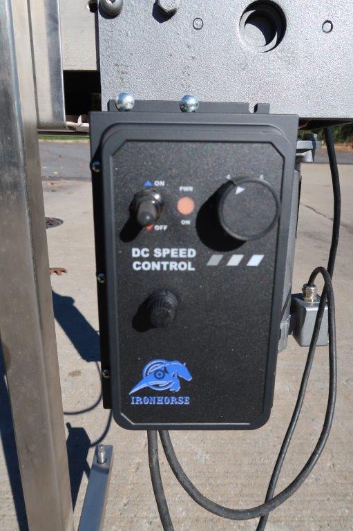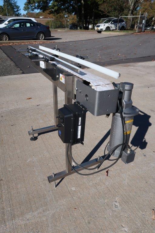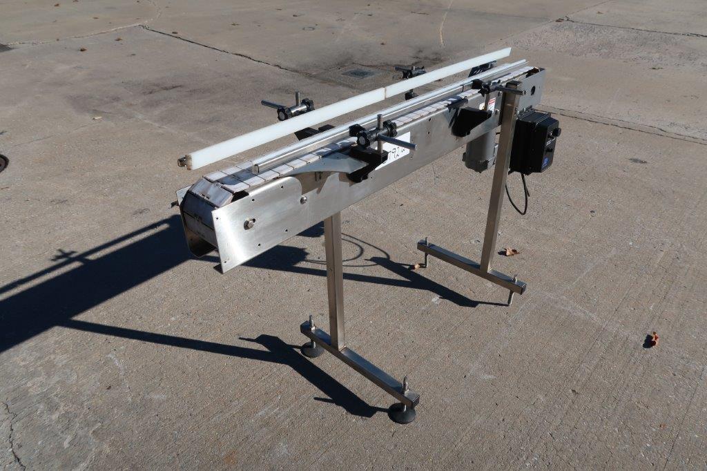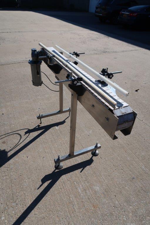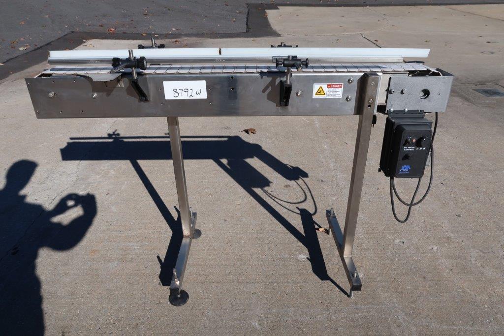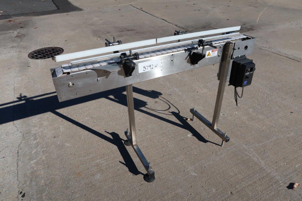 1 – Used 4-1/2 In. Wide X 57 In. Long Motorized Bottle Conveyor. With plastic tabletop conveyor chain. Conveyor has single phase electrics and is equipped with Ironhorse speed control for variable speed operation. (Stock # 8792W)