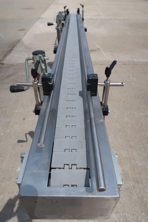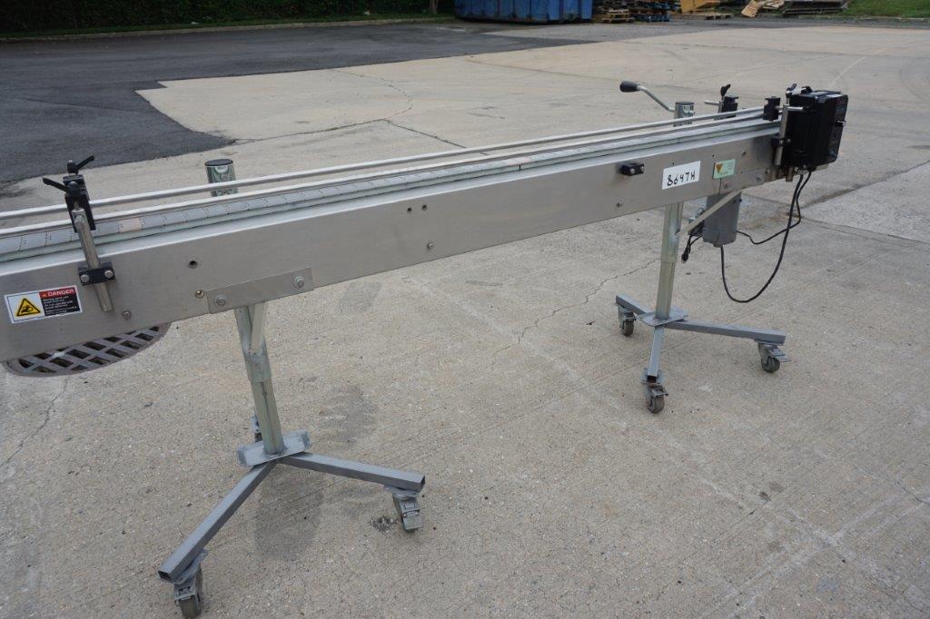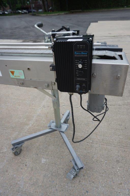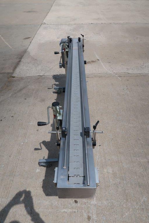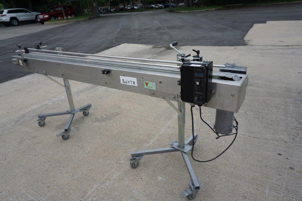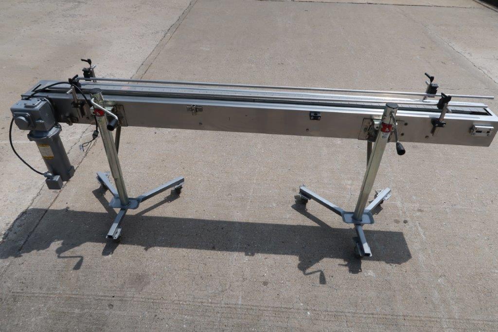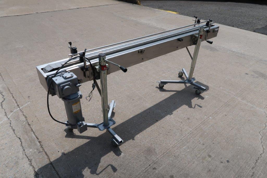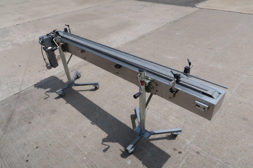 1 – Used All Fill (AFI) 8 Ft. Long Motorized Bottle Conveyor. On casters for portability, conveyor has guide rails and plastic table top conveyor chain. Equipped with fractional HP drive motor, conveyor lasted used in the personal care products industries. Equipped with “Penta-Drive” Variable Speed Control (Stock 8647H)
