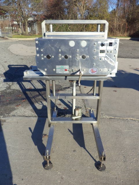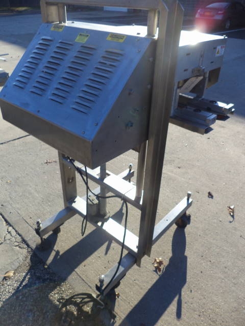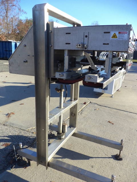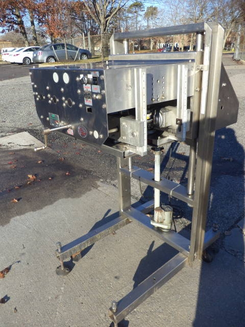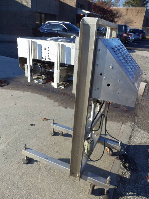 1-Used ELF Stainless Steel Gap Transporter, 757. Mounted on portable base with casters, unit has adjustable belts and single phase electrics. (Stock #7939A)
