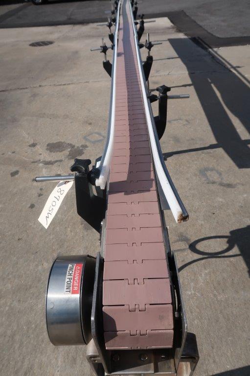 1-Used Garvey Approximately 21 Foot Long Stainless Steel Motorized Bottle Conveyor, Model 6000, S/N 12481. With 4-1/2 In. wide plastic tabletop conveyor chain, conveyor was last used in pharmaceutical packaging. Unit is mounted on stainless steel legs and is driven by a 1 HP motor, with Dart Variable Speed Control. (Stock #8705W)
