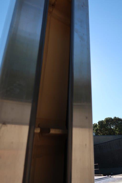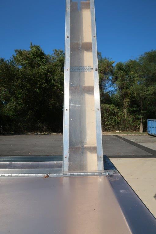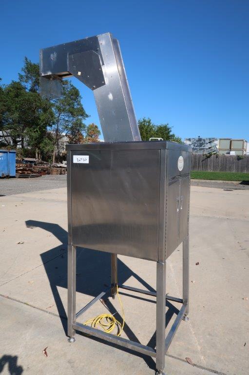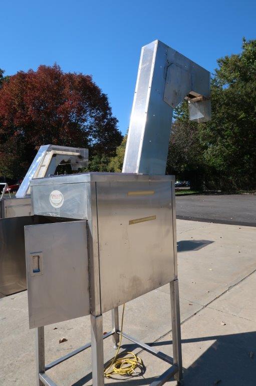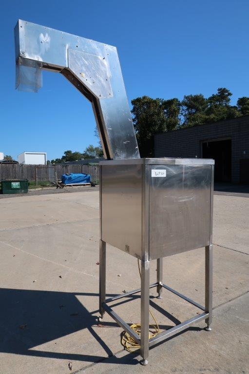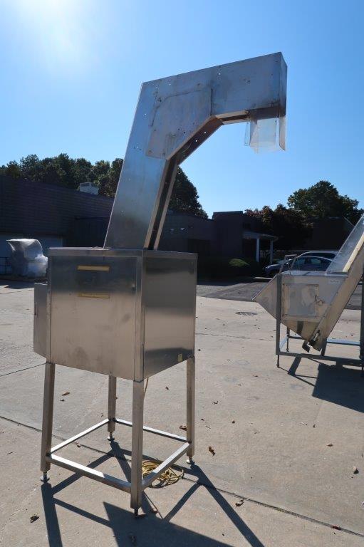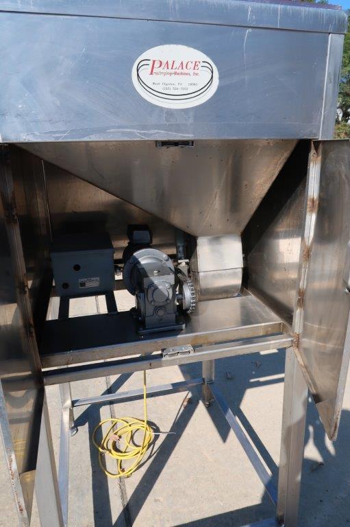 1 – Used Palace Packaging Model HG-4-62 Stainless Steel Inclined Cap Elevator/ Cleated Belt Conveyor, Serial number 2055(92).  With hopper, conveyor has approximate discharge height of 92 Inches. With  approx. 6 In. wide belt and 2 In. high cleats, cleats are spaced 12 In. center to center. Equipped with electric motor, with variable speed control (Stock # 8693G)