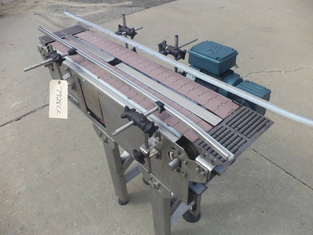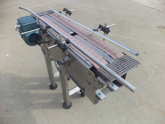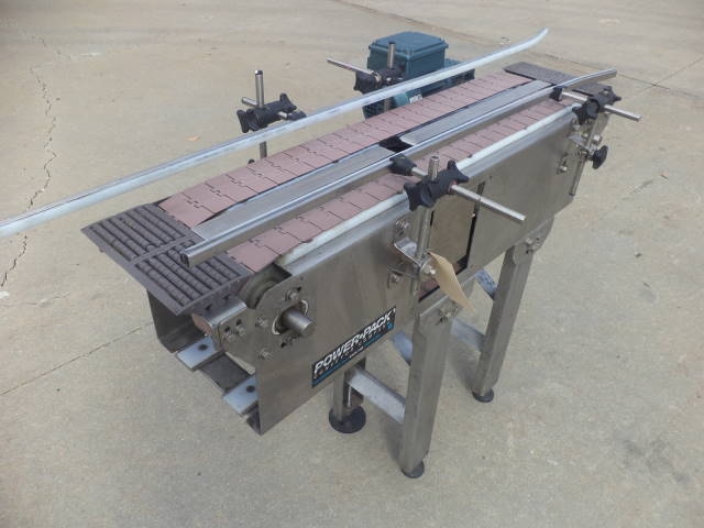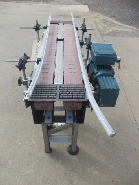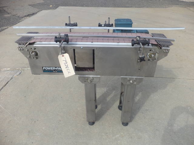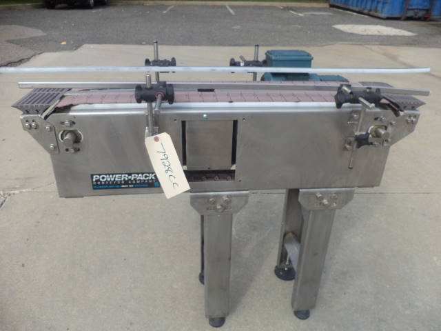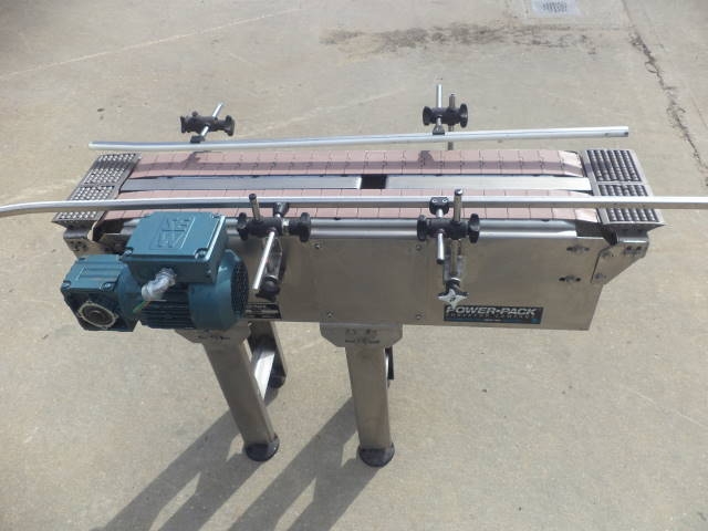 1-Used Power-Pack dual lane stainless steel bottle conveyor, Model TIP3253254, Serial Number 16260. Each lane has approximately 3-1/4 inch plastic tabletop conveyor chain and is on stainless steel legs measuring approximately 24 inches high. Driven by Eurodrive fractional HP motor. (Stock#7928CC)