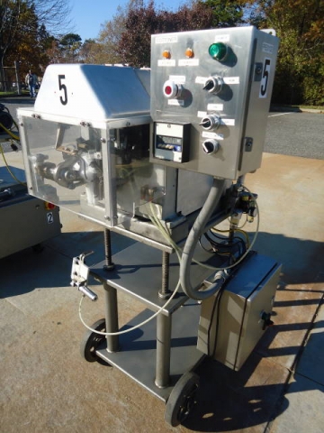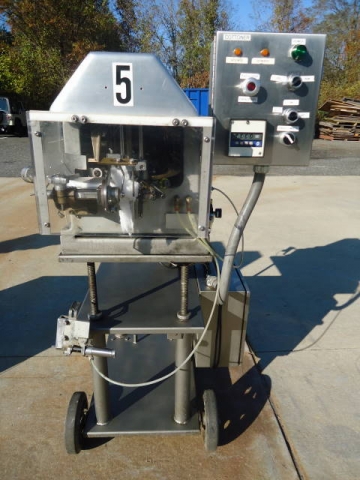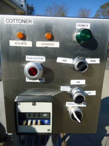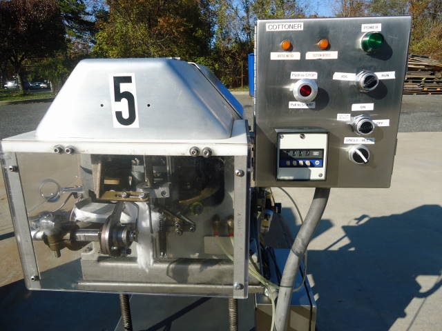1-USED LAKSO MODEL 52 AUTOMATIC BOTTLE COTTONER, S/N 509. RATED UP TO 60 BOTTLES PER MINUTE, UNIT HAS A PORTABLE STAND WITH CASTERS AND HAS AIR INDEXING OF CONTAINERS. CAN BE SUPPLIED WITH STAINLESS STEEL CONVEYOR AT ADDITIONAL COST. (STOCK # 7528C)