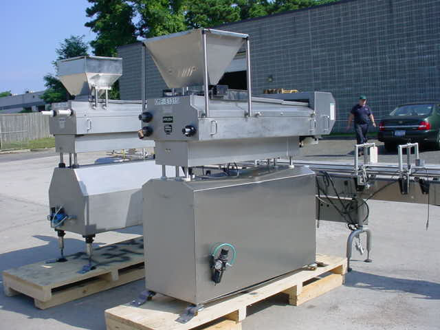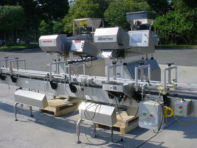 1-Used dt industries/kalish “swiftpack” automatic tablet/capsule bottling line. Equipped with swiftpack b12p3pts twelve lane counter, s/n m2123 and model spc8pd sixteen lane/eight lane double drop counter, s/n m599 respectively. Supplied with approx. 22′ long stainless steel dual lane indexing conveyor with controls for speed and spacing wheel and lane diverter.