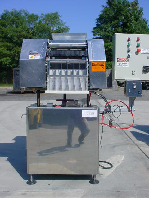 1-USED KING MODEL SC-4 AUTOMATIC SLAT COUNTER, S/N 132. RATED UP TO 100 CONTAINERS PER MINUTE, DEPENDING ON SIZE OF TABLETS OR CAPSULES BEING COUNTED. WITH SELF-CONTAINED CONTROL PANEL, MACHINE IS DESIGNED FOR PLACEMENT OVER CUSTOMER’S EXISTING CONVEYOR. ELECTRICS ARE 3 PHASE, 60 CYCLE 220 VOLT. PRESENTLY SUPPLIED WITH SLATS FOR SIZE “O” CAPSULES. OTHER SLAT SIZES AVAILALE AT ADDITIONAL COST.