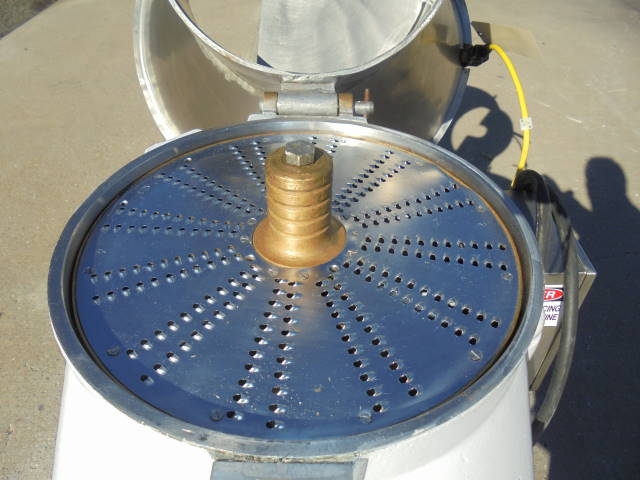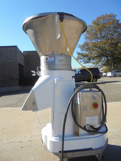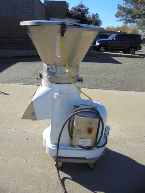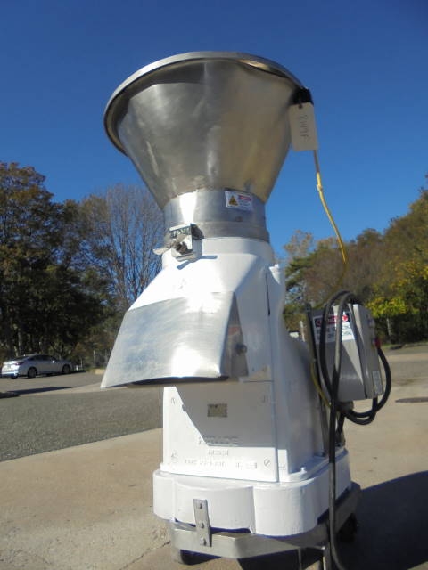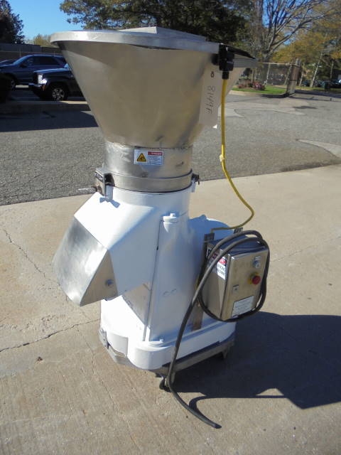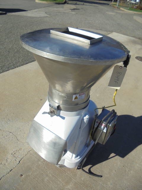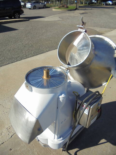 1-Used Hallde RG-3 Cheese Grater/Shredder, Machine #1259. Equipped with 26 in. diameter top mounted conical hopper, machine is mounted on dolly for portability. Equipped with 5.5kW (7.5HP) 220/380 Volt motor, machine is equipped with stainless steel grating disc and stainless steel starter box. Capable of slicing, dicing, shredding, grating, cutting of miscellaneous food products. Capacity rated up to approx. 30 kilos (approx. 60 Lbs.) per minute. (Stock #8149F)