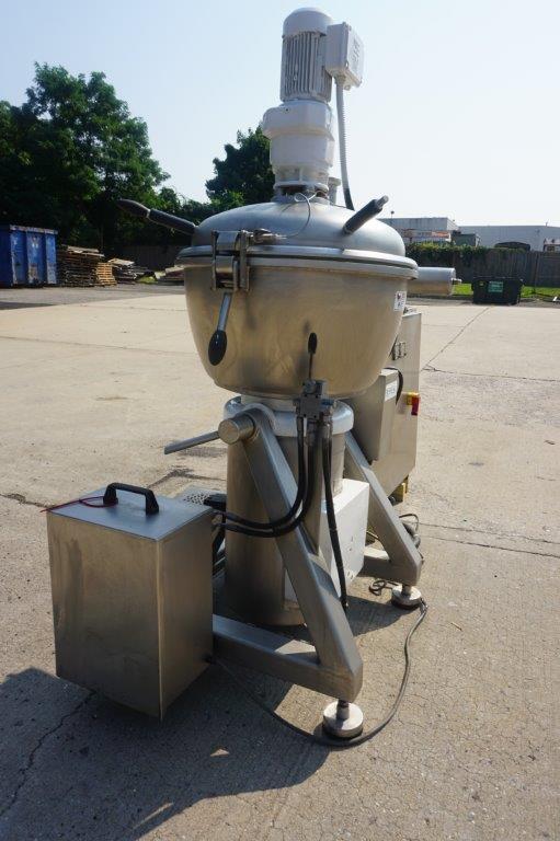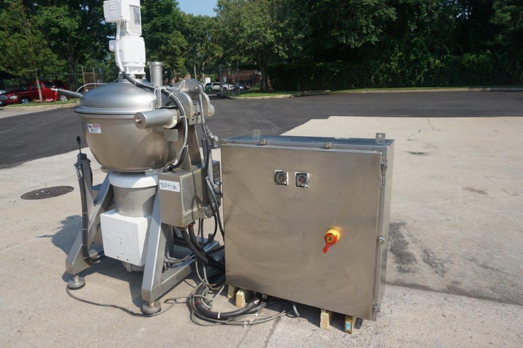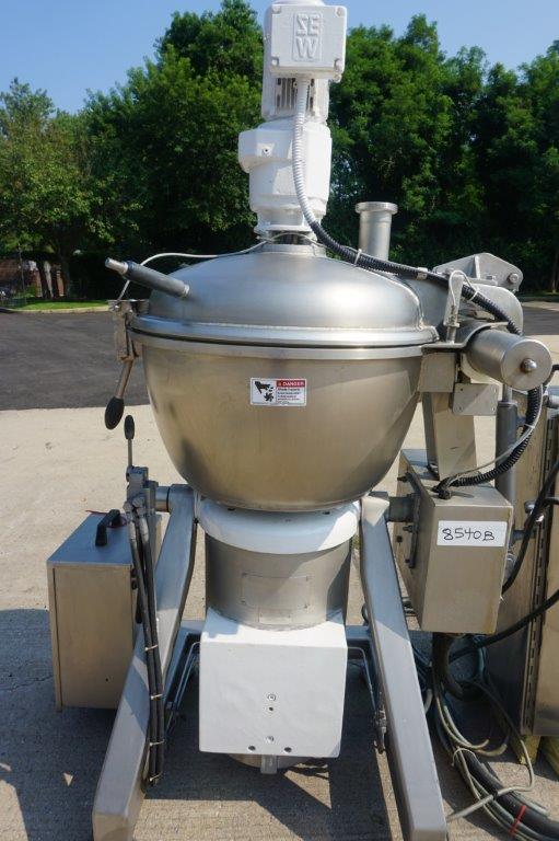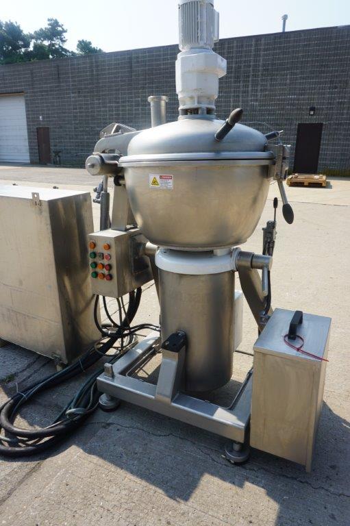 1- Used Stephan 80 Liter Vertical Cutter/Mixer, Model UM 80E, Machine Number 722.794.01. Last used in the manufacturing of Hummus, machine has high speed cutting blade driven by 18.5/22kW, 3 phase, 60 cycle, 220 Volt motor. Top entering mixing baffle arm driven by fractional HP motor. Machine is equipped with self-contained control panel and stainless steel starter box. (Stock # 8540B)
