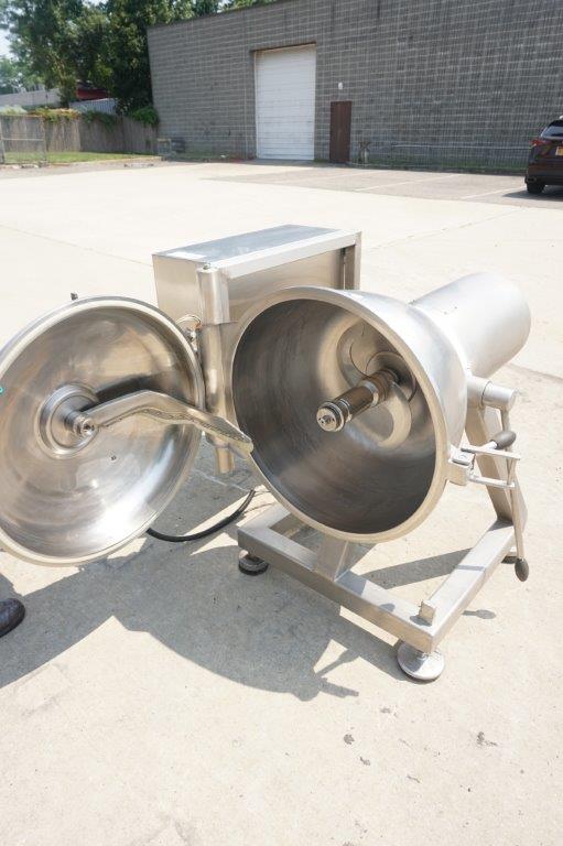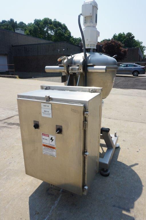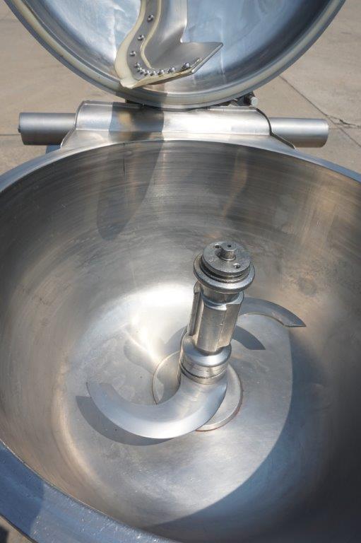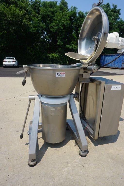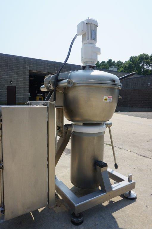 1-Used Stephan 80 Liter Vertical Cutter/Mixer, Model UM 80E-GNI, Machine Number 721.598.01. Last used in the manufacturing of Hummus, machine has high speed cutting blade underdriven by 18.5/22kW, 3 phase, 60 cycle, 220 Volt motor. Top entering mixing arm driven by fractional HP motor. Equipped with stainless steel starter box.(Stock # 8540A)
