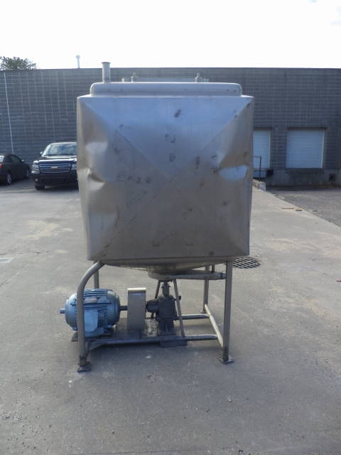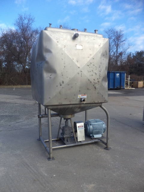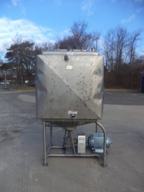 1-Used Crepaco approx. 300 Gallon Stainless Steel Jacketed “Likwifier”. Interior dimensions approx. 40 in. X 40 in., unit is jacketed for 75 PSI. Mixer has bottom impeller underdriven by 25 HP 3/60/220-440 volt motor. Equipped with approx. 24 in. X 24 in. top opening, along with four (4) assorted smaller openings. On stainless steel legs,likwifier has various “cosmetic dents” but has been checked electrically and operates and has been deemed “leak free”. (Stock #7853L)