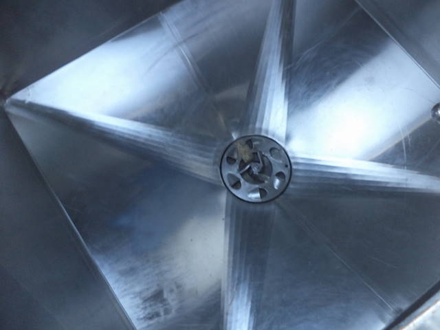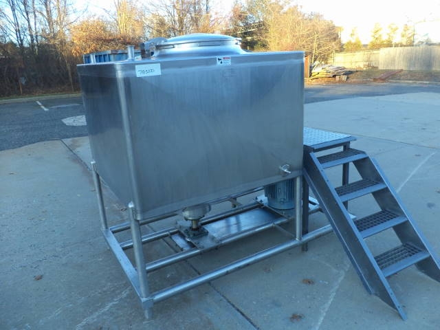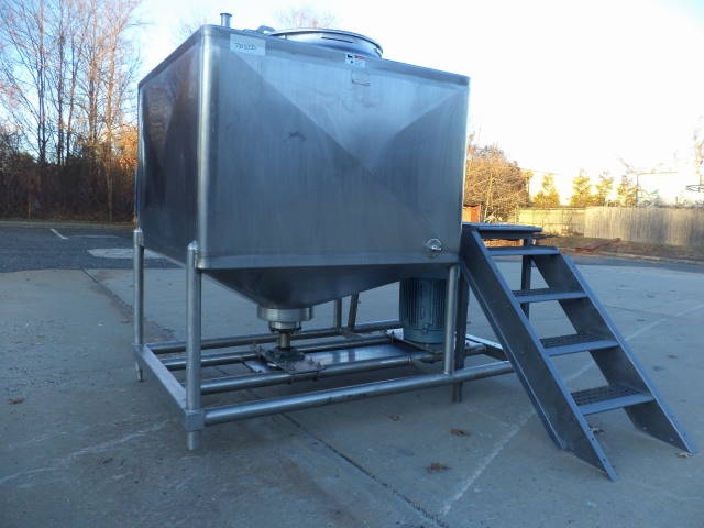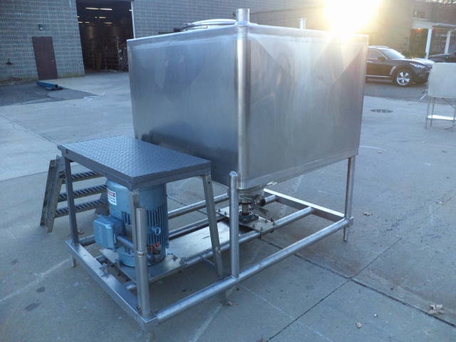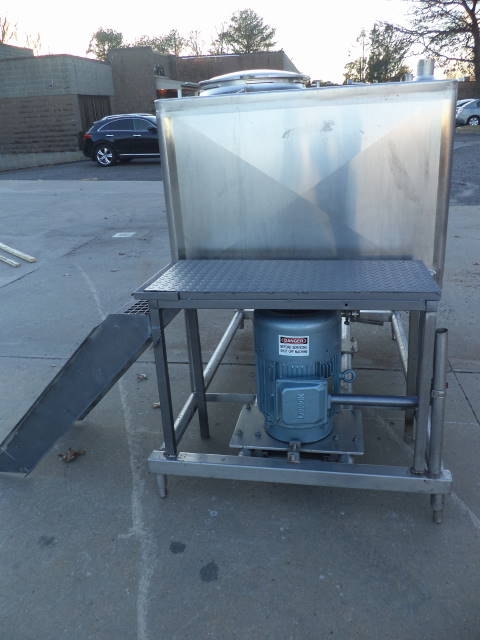1-Used Cherry Burrell 400 Gallon Stainless Steel “Likwifier”, S/N E-101-92 NO. 120. Tank has overall dimensions of approx. 54 in. X 54 in., high speed impeller driven by 40 HP 3/60/208-230-460 volt motor. Equipped with approx. 24 in. diameter top manway with hinged lid. There are four (4) assorted top openings as well. Equipped with approx. 2-1/2 in. diameter discharge valve. Can be supplied with staircase shown if required. (Stock#7853D)