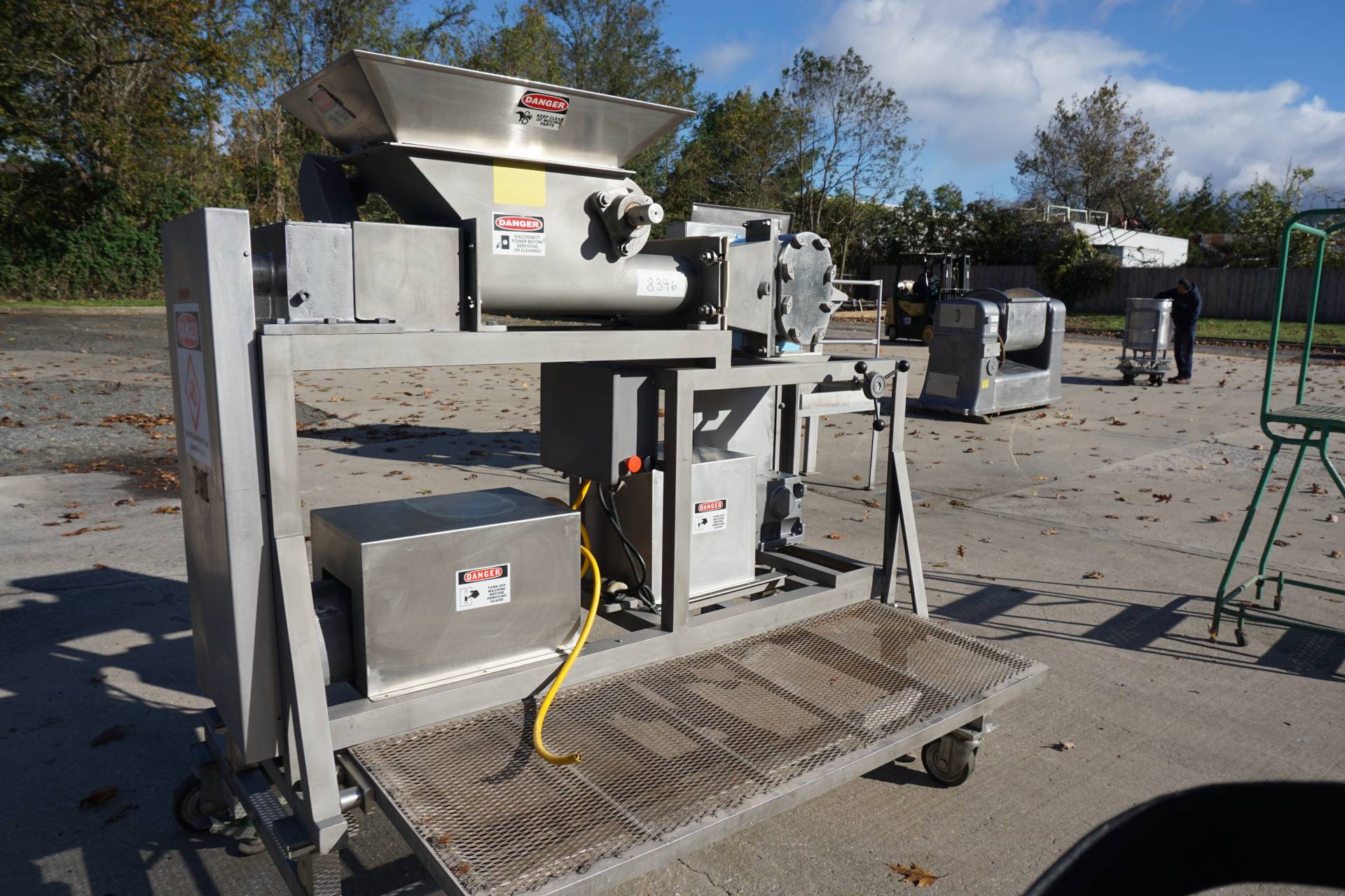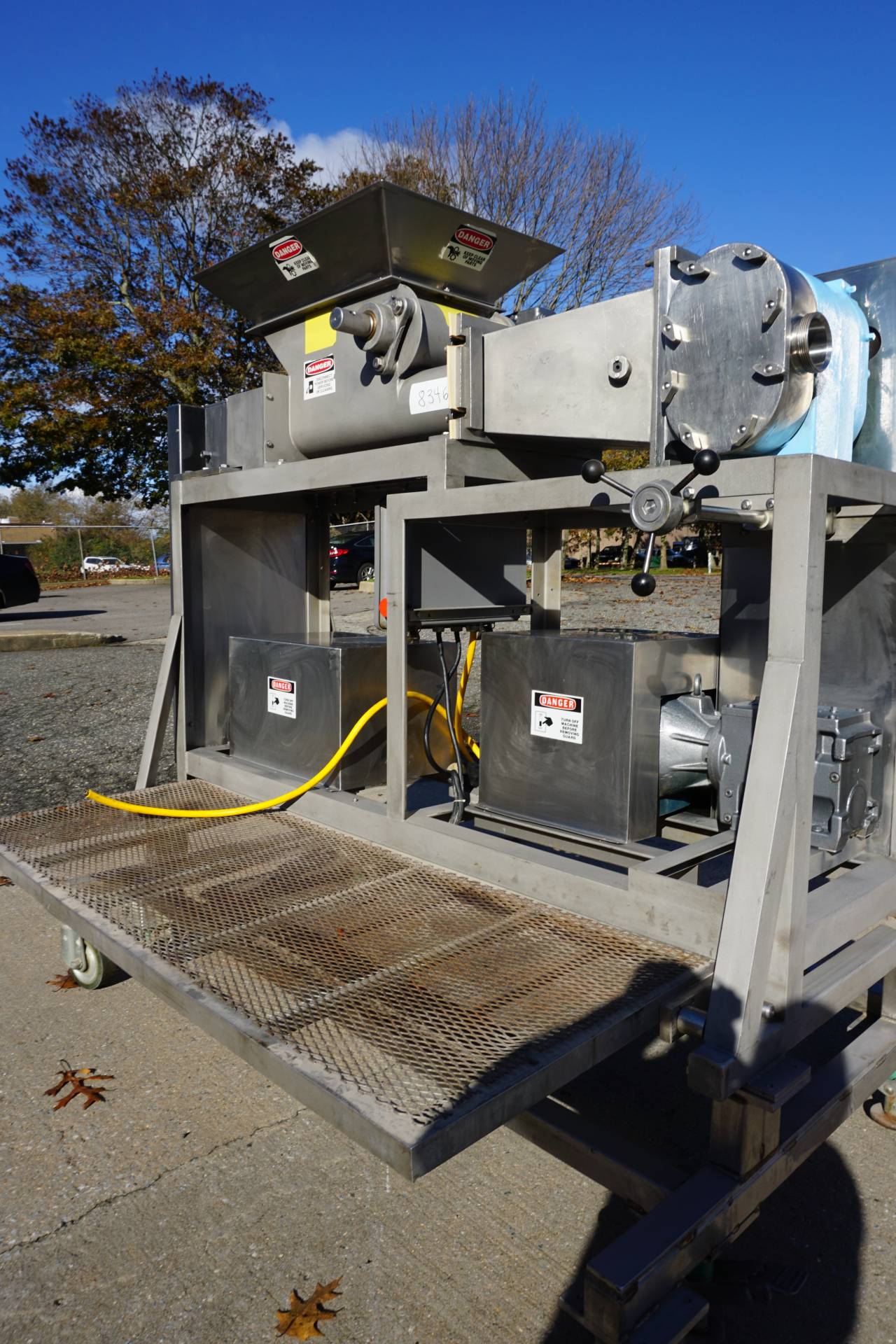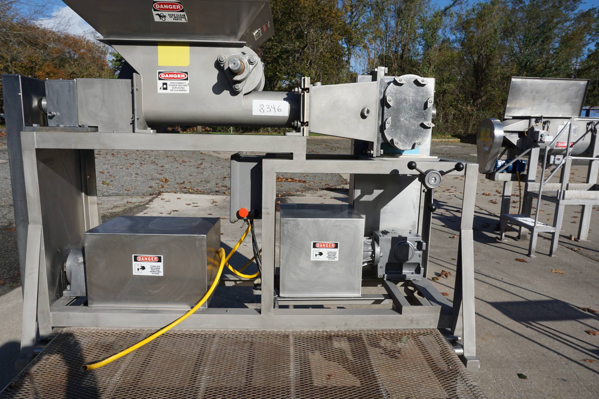1-Used Doering & Son Model 3PFL Stainless Steel Twin Screw Pump Feeding System, S/N 7805. Designed for pumping extremely viscous products in the food industry, machine has Stainless Steel Top Feed Hopper with twin feed screws driven by Eurodrive variable speed motor. Also equipped with Tri-Clover Model PR125 Stainless Steel Positive Displacement Pump with approx. 3 in. diameter discharge separately driven by Eurodrive variable speed drive. Mounted on portable stainless steel base with casters, machine has on/off starter box. Electrical specifications 3/60/230-460 volt. Suitable for products like frozen ground meat, sausage, tortellini dough, chewing gum, butter, whole fruits and vegetables and other similar viscous products. (Stock # 8436)