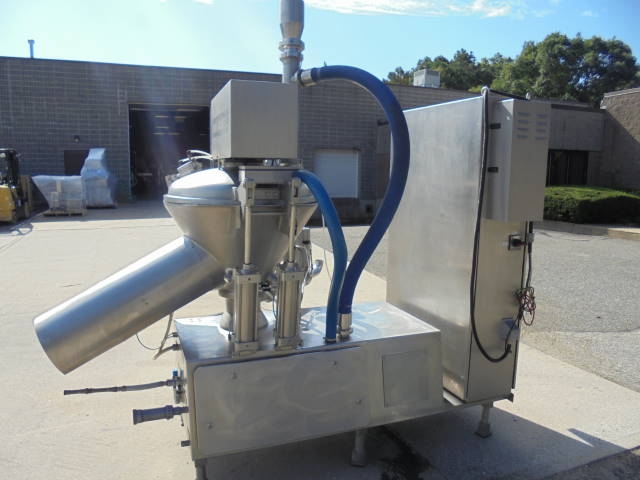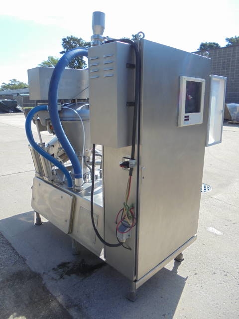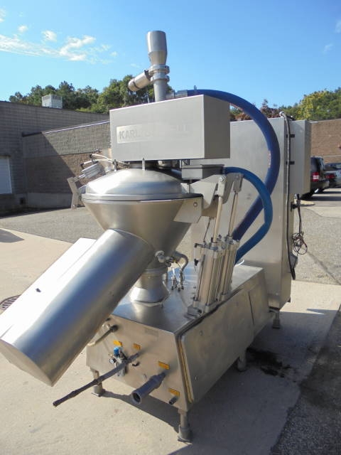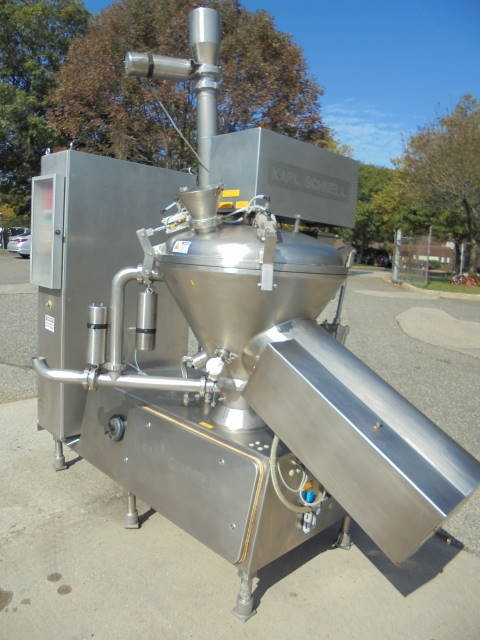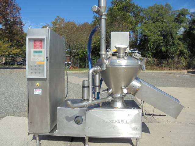 1-USED KARL SCHNELL TYPE 046 STAINLESS STEEL JACKETED VACUUM EMULSIFIER/CUTTER, SERIAL NUMBER 31430. LAST USED AS A MELTING CHEESE COOKER, UNIT CAN BE USED FOR PREMINCING, VACUUMIZING, MIXING AND EMULSIFYING ALL IN ONE MACHINE.  WITH APPROX. 130 LITER HOPPER, PRODUCT IS PRE-CUT, MIXED AND DEAERATED UNDER VACUUM CONDITIONS IN THE BOWL. WITH FRONT MOUNTED CONTROL PANEL WITH SIEMENS "SIMATIC OP17" DIGITAL CONTROL PAD, AND ABB COMMANDER 19 CHART RECORDER.   (STOCK #8145G)