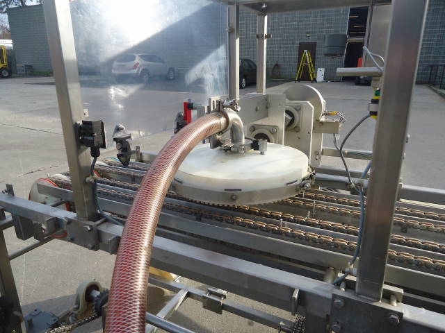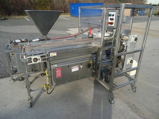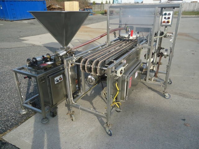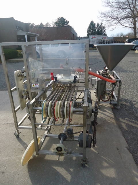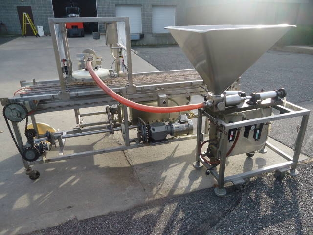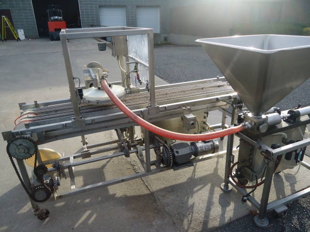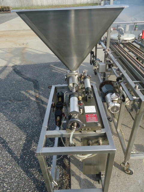 1-USED RAQUE SAUCE DEPOSITING SYSTEM FOR FROZEN PIZZA. CONSISTS OF RAQUE MODEL PF2-1 SINGLE PISTON FILLER S/N 1010274 AND RAQUE MODEL SL-100 AUTOMATIC CONVEYOR. LAST USED ON 16 IN. AND 12 IN. DIAMETER ROUND PIZZA SHELLS. SYSTEM INCLUDES DISPENSING VALVE CONNECTED BY FLEXIBLE TUBING FOR ACCURATE CONTROLLING AND PORTIONING OF VARIOUS TYPES OF FOOD PRODUCTS. FILLER HAS APPROX. 30 IN. X 30 IN. TOP MOUNTED HOPPER AND SYSTEM CAN HANDLE PIZZA SIZES FROM 5 IN . DIAMETER TO 16 IN . DIAMETER. LAST USED AT SPEEDS UP TO 60 PER MINUTE. FURTHER INFORMATION AVAILABLE UPON REQUEST. (STOCK # 7544)