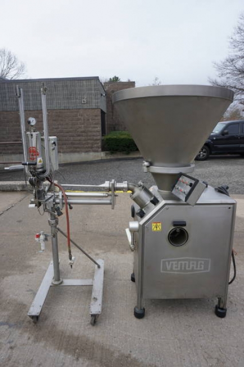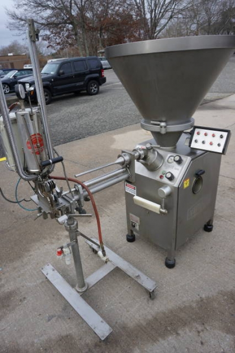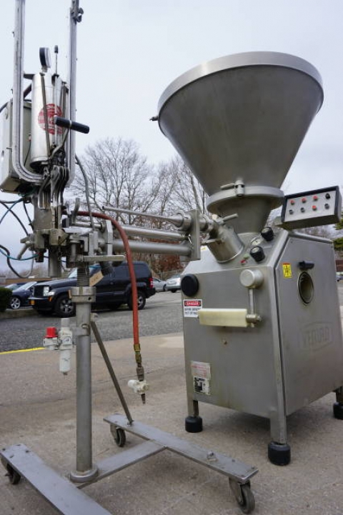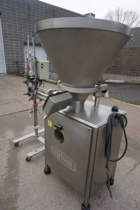 1-Used Vemag (Robert Reiser) Type 500 (128/90) Vacuum Stuffer, Serial Number 128.0815-1. With 30 in. diameter conical hopper, which is hinged and tilts down for easy cleaning. Hopper has fixed baffle and positive agitate and feed spiral for keeping product from “bridging” in hopper. With positive displacement double auger and self contained vacuum pump. With control panel on swivel arm, machine has electrical specifications 3/60/220 Volt. Last used in seafood processing, this food grade machine is suitable for many different types of products from meats, particulate products, pastes, butters, creams and other delicate products. (Stock# 8074B)