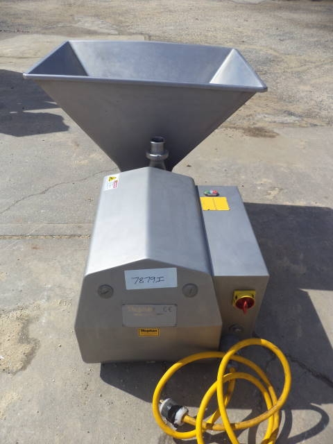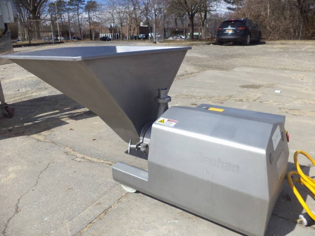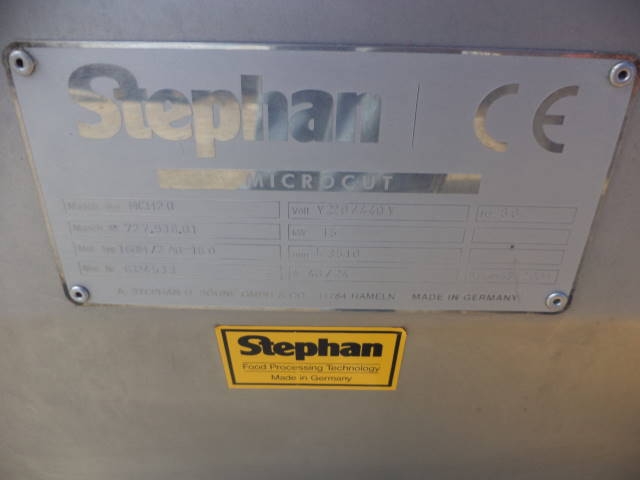 1-Used Stephan Microcut Model MCH 20 cutter/emulsifier, machine number 727.938.01. Used often in the sausage, baby food, fine pate, puree and other related industries, machine produces fine and smooth products.  Driven by 15KW (approximately 20HP) 3 phase, 60 cycle 220-440 Volt motor.  With stainless steel hopper, machine has approximately 2-1/2 inch diameter tri-clamp discharge.  (Stock# 7879i)