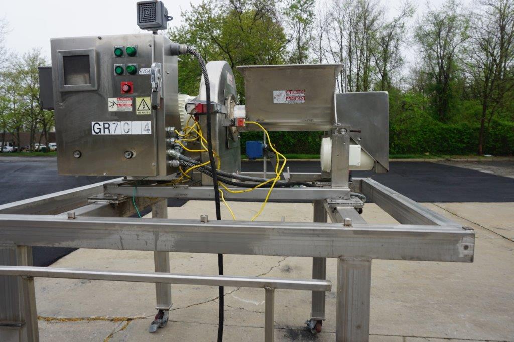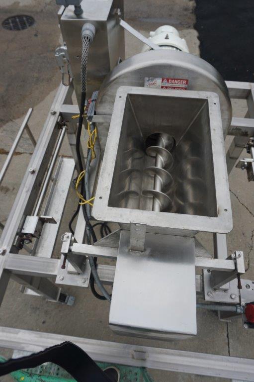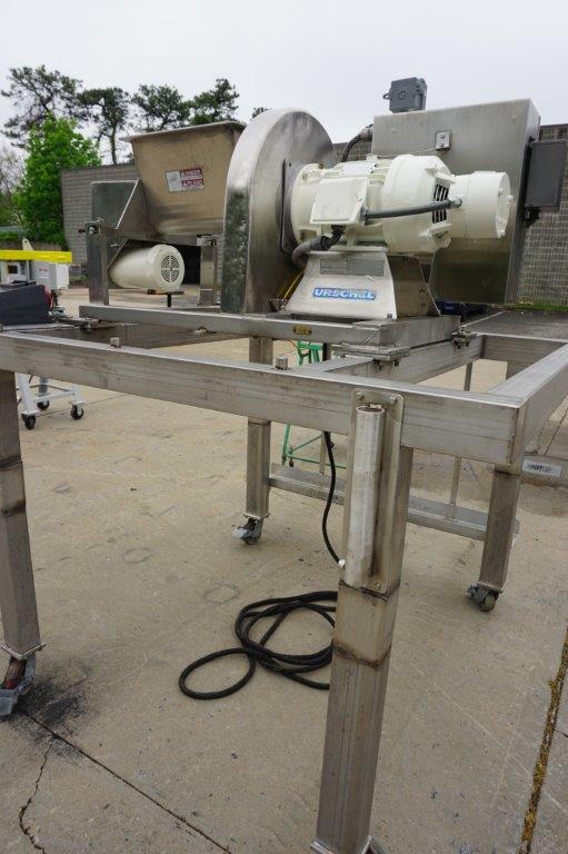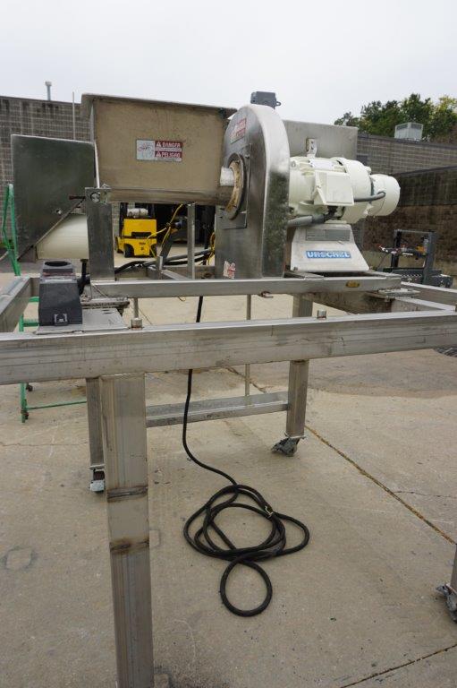 1-Used Urschel Model 3600 Stainless Steel Comitrol Machine, Serial Number 828. Mounted on a stainless steel base, machine is driven by 10 HP 3/60/230-460 Volt electric motor. Equipped with top mounted 11 in. x 18 in. stainless steel feed hopper with horizontal feed screw, separately driven by 1 HP motor. Equipped with stainless steel starter box, this versatile machine can be used for flake cutting, chopping, emulsifying and pureeing foods such as meat, poultry, fruits, vegetables and cheeses. (Stock # 8505)