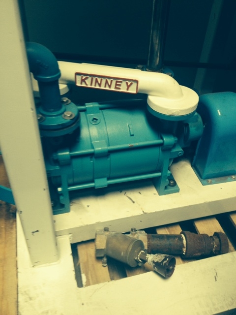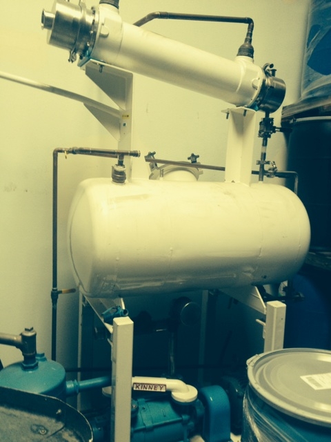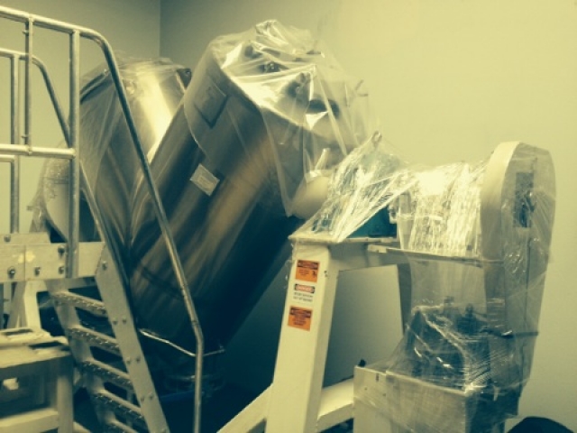 1-Used Gemco 30 Cu. Ft. Stainless Steel Twin Shell “V” Blender/Dryer/Formulator, S/N 90057. Vessel is jacketed for 15 PSI @ 250 degrees F and also rated full vacuum @ 250 degrees F, National Board #1869. Equipped with 3 HP main drive and 7.5 HP motor for high speed intensifier bar. Last used in personal care products manufacturer. Supplied with Kinney Vacuum Pump with Receiver. (Stock #L1208)