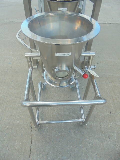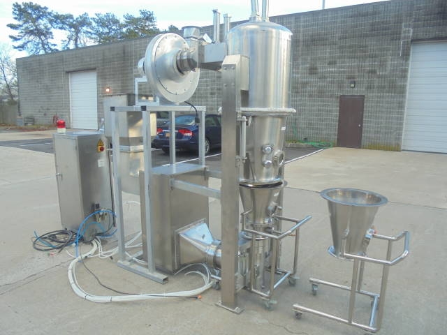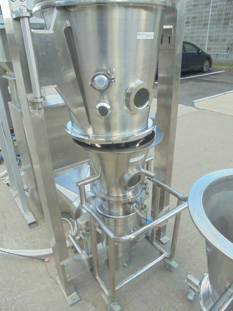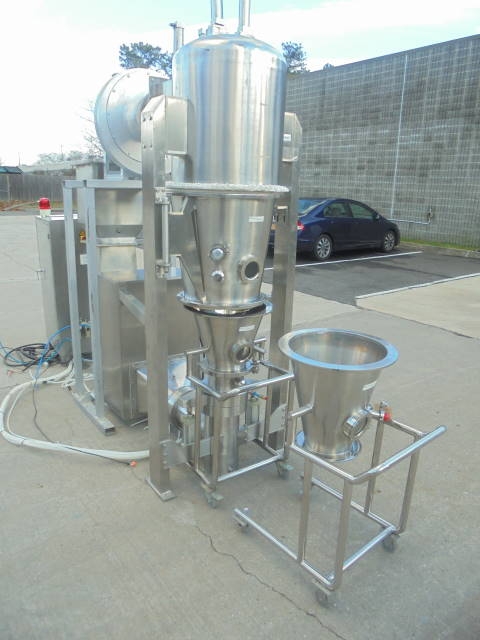 1-Used Changzhou Jiafa Model FLP-5 Stainless Steel Lab Fluid Bed Granulator/Coater/Dryer, Number 2008-100. This multi-function equipment integrates spray drying-granulating and fluid coating drying in one body (granulating, coating and drying). Capacities 1 kg. to 5 kg. per batch in granulating, coating. With two (2) containers on casters, control panel, two heads and motorized fan. (Stock #8061)