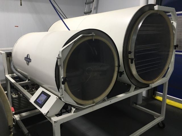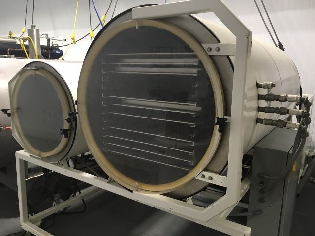 1-Used Freeze Dry Company Model 3600 SSX1 Horizontal Freeze Dryer. Dimensions of product chamber 36 In. diameter x 80 In. deep. Rated 144 Sq. Ft. surface area, freeze dryer has 12 electrically heated aluminum shelves, each measuring 24 In. x 72 In. Equipped with electrically heated shelf ceiling for top-shelf, machine has 24 In. diameter x 48 In. deep ice bank, Hy Vac “HyperVac 1,000” Vacuum pump and Horner touch screen controller. Last used to freeze dry food products for home food storage. (Stock #L1273)