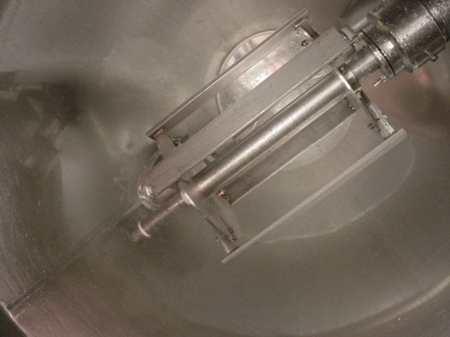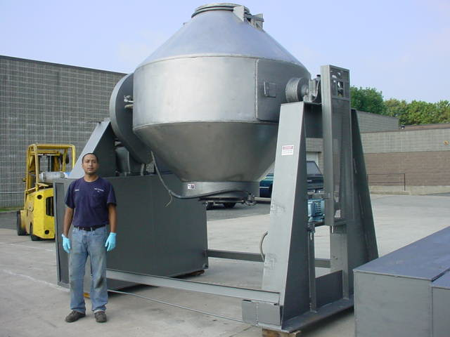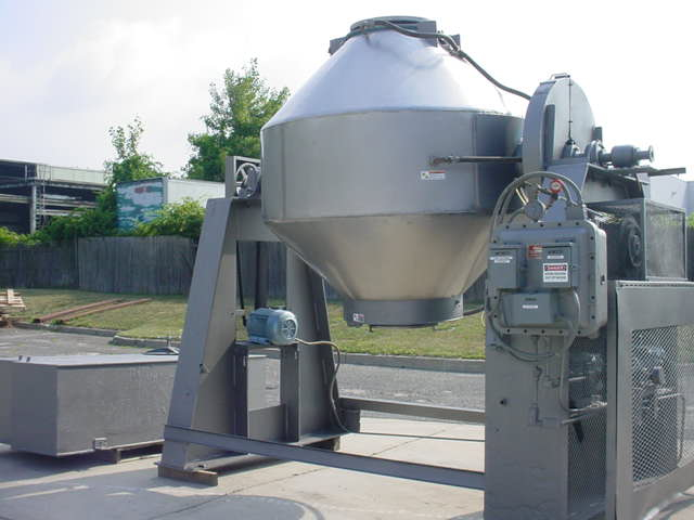 1-USED APPROX. 75 CU.FT. STAINLESS STEEL JACKETED DOUBLE CONE TUMBLING BLENDER. EQUIPPED WITH HIGH SPEED INTENSIFIER BAR, BLENDER ALSO HAS CAPABILITIES OF LIQUID ADDITION. DRIVEN BY 10 HP 3/60/230-460 VOLT, EXPLOSION PROOF MAIN DRIVE MOTOR AND SECONDARY 5 HP MOTOR PROVIDING FOR DUAL SPEED OPERATION OF BLENDER. ALSO EQUIPPED WITH SEPARATE 5 HP 3/60/208-220-440 VOLT EXPLOSION PROOF MOTOR FOR THE INTERIOR INTENSIFIER BAR. EQUIPPED WITH APPROX. 20″ DIAMETER AND 16″ DIAMETER INLET AND OUTLET FEEDER AND DISCHARGE PORTS. BLENDER ON STAND CURRENTLY PROVIDING FOR UNDERCLEARANCE OF APPROX. 44″, BUT INCLUDED ARE SEPARATE LEG EXTENSIONS WHICH CAN PROVIDE AN ADDITIONAL 27″ HIGH CLEARANCE. BLENDER PROVIDES FLOOR DIMENSIONS OF APPROX. 134″ WIDE X 90″ DEEP. (STOCK # 7411)