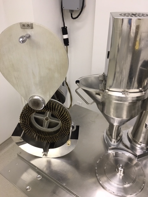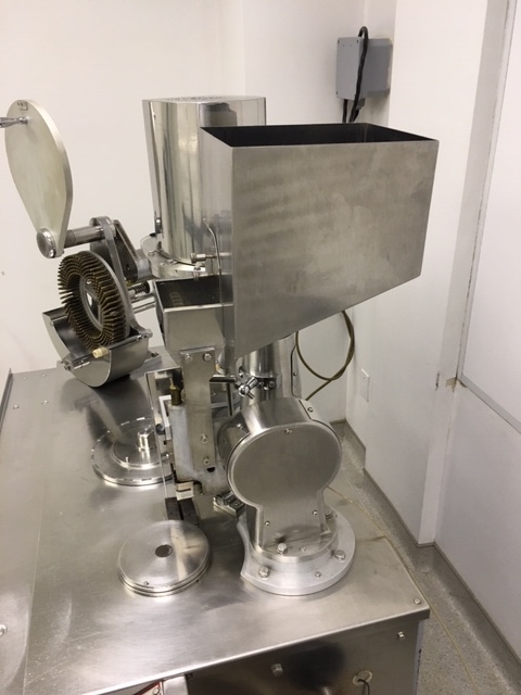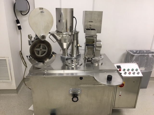 1-Used Capsugel Ultra 8 Semi-Automatic Production Scale Capsule Filling Machine. Rated up to approx. 25,000 capsules per hour, machine comes equipped with tooling for size 0, size 1 and size 00 capsules. Equipped with hopper and miscellaneous other features. (Stock #L1319)