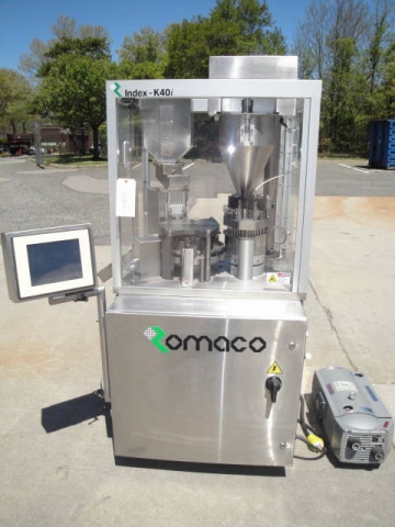 1-USED INDEX/ROMACO MODEL K40i AUTOMATIC ENCAPSULATOR, S/N 2186-3. RATED UP TO 40,000 CAPSULES PER HOUR, MACHINE CURRENTLY HAS SIZE 0 TOOLING BUT OTHER TOOLING IS AVAILABLE AT ADDITIONAL COST. WITH TOUCH SCREEN CONTROL, ENCAPSULATOR HAS VACUUM PUMP AND NUMEROUS OTHER FEATURES. (STOCK # 7487P)