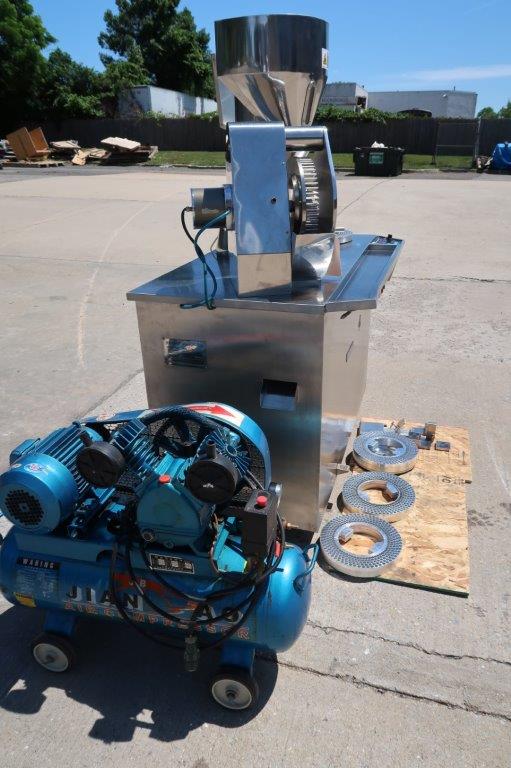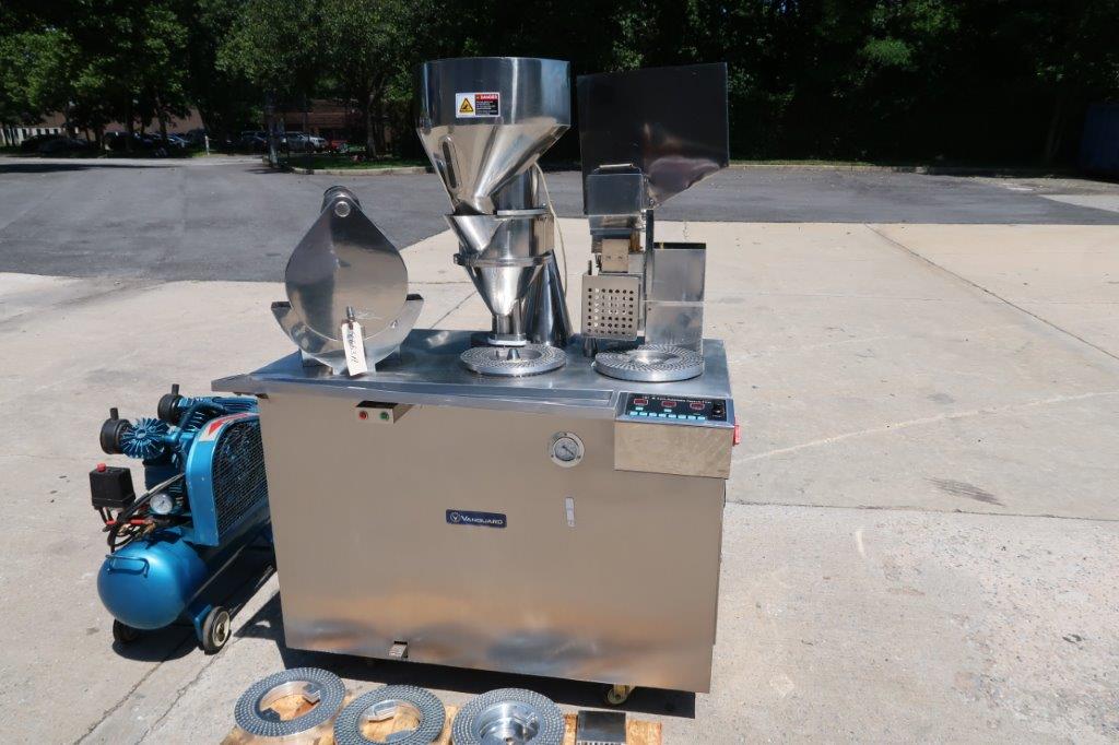 1-Used Vanguard Model VSF-111 Semi-Automatic Capsule Filler, Serial number 4113. Rated up to 25,000 capsules per hour, this GMP machine is supplied with tooling for both “00” and “0” size capsules. On casters for portability, machine capable of capsule range from size 00 to size 4 capsules. Electrical specifications 3/60/240 volt. With stainless steel cabinetry, machine is supplied with 1.5 kw air compressor and can also be supplied with Vanguard capsule polisher and Vanguard tablet counter at an additional cost. (Stock# 8653A)